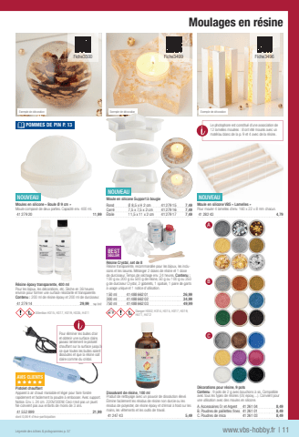NOUVEAUMoule en silicone Support %u00e0 bougieRond%u00d8 8,5 x H 2 cm41279 157,49Carr%u00e97,5 x 7,5 x 2 cm41279 167,49%u00c9toile11,5 x 11 x 2 cm41279 177,49NOUVEAUMoules en silicone %u00ab Boule %u00d8 9 cm %u00bbMoule compos%u00e9 de deux parties. Capacit%u00e9 env. 400 ml.41279 2011,99R%u00e9sine %u00e9poxy transparente, 400 mlPour les bijoux, les d%u00e9corations, etc. S%u00e8che en 36 heures environ pour former une surface r%u00e9sistante et transparente. Contenu : 200 ml de r%u00e9sine %u00e9poxy et 200 ml de durcisseur.41279 1429,991kg=74,97Attention H315, H317, H319, H335, H411BESTSELLERR%u00e9sine Crystal, set de 8R%u00e9sine transparente, recommand%u00e9e pour les bijoux, les inclusions et les lasures. M%u00e9langer 2 doses de r%u00e9sine et 1 dose de durcisseur. Temps de s%u00e9chage env. 24 heures. Contenu : 100 g ou 200 g ou 500 g de r%u00e9sine, 50 g ou 100 g ou 250 g de durciseur Crystal, 2 gobelets, 1 spatule, 1 paire de gants %u00e0 usage unique et 1 notice d'utilisation.150 ml41488 662 0126,99300 ml41488 662 0234,99750 ml41488 662 0349,99Danger H302, H314, H315, H317, H319, H411, H412NOUVEAUMoule en silicone VBS %u00ab Lamelles %u00bbPour mouler 4 lamelles d'env. 160 x 22 x 8 mm chacun.41282 434,79AVIS%u00a0CLIENTSxxxxxPistolet chauffantAppareil %u00e0 air chaud maniable et l%u00e9ger pour faire fondre rapidement et facilement la poudre %u00e0 embosser. Avec support. Notice. Env. L 24 cm. 220V/300W. Ceci n'est pas un jouet. Ne convient pas aux enfants de moins de 3 ans.41552 89921,99dont 0,06 %u20ac d'%u00e9co-participationDissolvant de r%u00e9sine, 100 mlProduit de nettoyage avec un pouvoir de dissolution %u00e9lev%u00e9. %u00c9limine facilement les r%u00e9sidus de r%u00e9sine non durcie ou les r%u00e9sidus de polyester, de r%u00e9sine %u00e9poxy et d'%u00e9mail %u00e0 froid sur les mains, les v%u00eatements et les outils de travail.41247 435,49D%u00e9corations pour r%u00e9sine, 9 potsContenu : 9 pots de 2 g avec bouchons %u00e0 vis. Compatible avec tous les types de r%u00e9sines (UV, epoxy,...). Convient pour une utilisation avec des moules en silicone. A. Accessoires Or et Argent41261 048,49B. Poudres de paillettes fi nes41261 018,49C. Poudres de mica41261 038,49www.vbs-hobby.frL%u00e9gende des ic%u00f4nes & pictogrammes p. 57| 11Moulages en r%u00e9sine AExemple de d%u00e9corationExemple de d%u00e9corationExemple de d%u00e9corationPOMMES DE PIN P. 13 Pour %u00e9liminer les bulles d'air et obtenir une surface claire, passez lentement le pistolet chauffant sur la surface jusqu'%u00e0 ce que toutes les bulles soient dissoutes et que la r%u00e9sine soit claire comme du cristal.BCFiche3500Fiche3499Fiche3496Le photophore est constitu%u00e9 d'une association de 12 lamelles moul%u00e9es : 8 ont %u00e9t%u00e9 moul%u00e9s avec un mat%u00e9riau blanc de la p. 9 et 4 avec de la r%u00e9sine..