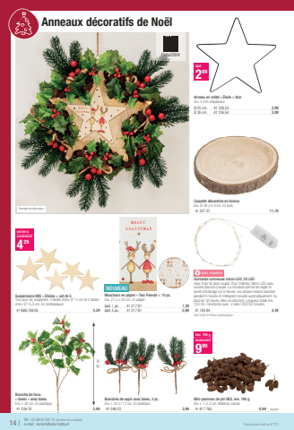 Exemple de d%u00e9corationAnneau en m%u00e9tal %u00ab %u00c9toile %u00bb, NoirEnv. 4 mm d'%u00e9paisseur.%u00d8 25 cm41126 532,99%u00d8 35 cm41126 543,99Coupelle d%u00e9corative en %u00e9corceEnv. %u00d8 28 x H 4 cm. En bois.41237 2711,79Suspensions VBS %u00ab %u00c9toiles %u00bb, set de 5Trou pour les suspendre. 3 %u00e9toiles d'env. %u00d8 14 cm et 2 %u00e9toiles d'env. %u00d8 15,5 cm. En contreplaqu%u00e9.41666 756 054,29NOUVEAUMouchoirs en papier %u00ab Two Friends %u00bb, 10 pc.Env. 21,5 x 22 cm. En papier.%u00e0pd. 1 pc.41217 811,29%u00e0pd. 5 pc.41217 810,99yavec minuterieGuirlande lumineuse micro-LED, 20 LEDAvec fi l de fer dor%u00e9 souple. Pour l'int%u00e9rieur. Micro-LED avec lumi%u00e8re blanche chaude. La minuterie permet de r%u00e9gler la dur%u00e9e d'%u00e9clairage sur 6 heures. Les lampes restent allum%u00e9es pendant 6 heures et s'%u00e9teignent ensuite automatiquement. Au bout de 18 heures, elles se rallument. Longueur totale env. 100 cm. Fonctionne avec 2 piles CR2032 incluses.41184 844,49dont 0,02 %u20ac d'%u00e9co-participationBranches de sapin avec baies, 3 pc.Env. L 20 x l 12 cm. En plastique.41246 233,99Branche de houx %u00ab Green %u00bb avec baiesEnv. L 40 cm. En plastique.41236 703,99Mini-pommes de pin VBS, env. 190 gEnv. L 1,5-3 cm. Mat%u00e9riau naturel.41617 7659,991kg=52,58%u00e0pd.299set de 5seulement429Env. 190 gseulement999T%u00e9l : 03 69 61 69 10 (num%u00e9ro non surtax%u00e9)14 |e-mail : service@vbs-hobby.frTous les prix sont en %u20ac TTC. Anneaux d%u00e9coratifs de No%u00ebl Fiche3504 40 cm