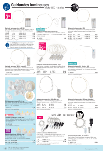 La minuterie permet de r%u00e9gler la dur%u00e9e d'%u00e9clairage pour 6 heures. Les lampes restent allum%u00e9es pendant 6 heures puis s'%u00e9teignent automatiquement. Au bout de 18 heures, elles se rallument.Guirlande lumineuse micro-LED VBS Pour l'int%u00e9rieur. Lumi%u00e8re blanche chaude. Minuterie. C%u00e2ble en fi l d'argent. Fonctionne avec 3 piles 1,5 V AA non fournies.10 LED1,3 m41689 281 013,4920 LED2,2 m41689 298 013,9930 LED3,2 m41689 304 015,4940 LED4,2 m41689 311 016,49dont 0,02 %u20ac d'%u00e9co-participationNOUVEAUGuirlande lumineuse VBS 30 micro-LEDPour l'int%u00e9rieur. Lumi%u00e8re blanche chaude. Minuterie. C%u00e2ble en fi l m%u00e9tallique argent%u00e9 d'env. L 2,6 m. Fonctionne avec 2 piles AA (non incluses).41268 893,69dont 0,02 %u20ac d'%u00e9co-participationGuirlande lumineuse micro-LEDPour l'int%u00e9rieur. Lumi%u00e8re blanche chaude. Minuterie. C%u00e2ble en fi l de fer fl exible. Fonctionne avec 2 ou 3 piles AA (non incluses).20 LED1 mDor%u00e941236 843,7540 LED2 mDor%u00e941236 904,7940 LED101 cmArgent%u00e941265 334,79dont 0,02 %u20ac d'%u00e9co-participationGuirlande lumineuse VBS 20 micro-LEDPour l'int%u00e9rieur. Avec interrupteur. Lumi%u00e8re blanche chaude. Minuterie. Circuit lin%u00e9aire. C%u00e2ble transparent d'env. L 210 cm. Fonctionne avec 2 piles boutons CR 2032 incluses.41689 7934,49dont 0,02 %u20ac d'%u00e9co-participationGuirlandes lumineuses micro-LED VBS, 10 pc.Pour l'int%u00e9rieur. Interrupteur. Lumi%u00e8re blanche chaude. Minuterie. C%u00e2ble transparent. Fonctionnent avec 2 piles boutons CR 2032 incluses.10 LED1,05 m41173 7229,9920 LED2,1 m41173 7335,99dont 0,02 %u20ac d'%u00e9co-participationNOUVEAUGuirlande lumineuse VBS 10 micro-LEDPour l'int%u00e9rieur. Lumi%u00e8re blanche chaude. Minuterie. C%u00e2ble en fi l m%u00e9tallique dor%u00e9 d'env. 67 cm. Fonctionne avec 2 piles CR2032 incluses.41268 883,99dont 0,02 %u20ac d'%u00e9co-participationGuirlande lumineuse micro-LED avec c%u00e2ble dor%u00e9Pour l'int%u00e9rieur. Lumi%u00e8re blanche chaude. Minuterie. C%u00e2ble en fi l de fer fl exible. Fonctionne avec 2 ou 3 piles AA (non incluses).20 LED1 m41184 844,4930 LED1,95 m41236 784,79dont 0,02 %u20ac d'%u00e9co-participationGuirlande lumineue micro-LED, c%u00e2ble noirPour l'int%u00e9rieur. Lumi%u00e8re blanche chaude. C%u00e2ble souple. Minuterie. Fonctionne avec 2 piles CR2032 incluses.10 LED92 cm41265 283,4920 LED100 cm41184 834,4930 LED190 cm41265 294,59dont 0,02 %u20ac d'%u00e9co-participationMini-boules lumineuses LED, 10 pc.Pour %u00e9clairer de l'int%u00e9rieur des objets d%u00e9coratifs. Lumi%u00e8re blanche chaude. Fonctionnent avec une pile LR41 incluse. Env. %u00d8 1,5 cm. En plastique.41276 272,99dont 0,02 %u20ac d'%u00e9co-participationBESTSELLERBougies chauffe-plat LED VBS, 4 pc.Flamme vacillante, autonomie d'env. 72 h, interrputeur, fonctionnent avec des piles boutons LR44 incluses. Env. %u00d8 3,5 cm. En plastique.%u00e0pd. 1 pc.41687 9803,49%u00e0pd. 3 pc.41687 9802,97dont 0,02 %u20ac d'%u00e9co-participationGuirlande lumineuse VBS 10mini-LEDPour l'int%u00e9rieur. Lumi%u00e8re blanche chaude. Interrupteur. Circuit circulaire. C%u00e2ble transparent d'env. 2,95 m. %u00c9cart entre les LED env. 15 cm. 230 V.1 pc.41688 314 018,995 pc.41689 06932,99*Pour l'achat de 5 pc., par rapport au prix %u00e0 l'unit%u00e9 dont 0,02 %u20ac d'%u00e9co-participationGuirlande lumineuse VBS, 20 mini-LEDPour l%u2019int%u00e9rieur. Circuit lin%u00e9aire avec interrupteur. C%u00e2ble transparent d'env.3,10 m, L totale env. 7,75 m, env. 26 cm entre chaque LED. 230 V.41688 321 0112,99dont 0,02 %u20ac d'%u00e9co-participation%u00e0pd.34910 pi%u00e8ces%u00e0pd.2999T%u00e9l : 03 69 61 69 10 (num%u00e9ro non surtax%u00e9)18 |e-mail : service@vbs-hobby.frTous les prix sont en %u20ac TTC.yminuterieBougies chauffe-plat LED VBS, 4 pc.Flamme vacillante. Minuterie r%u00e9gl%u00e9e sur 4 heures. Fonctionnent avec une pile bouton CR 2032 incluse. Env. %u00d8 3,7 x H 3,7 cm. En plastique.41689 3667,49dont 0,02 %u20ac d'%u00e9co-participation Guirlandes lumineuses Mini-LED - sur secteur Micro-LED - %u00e0 piles - 26 %*
