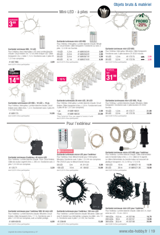 -20%Guirlande lumineuse VBS, 10 LEDPour l'int%u00e9rieur. Avec interrrupteur. LED avec lumi%u00e8re blanche chaude. Circuit lin%u00e9aire. Env. 10 cm entre chaque LED. C%u00e2ble transparent. Env. L totale 1,15 m. Fonctionne avec 2 piles AA 1,5 V non comprises.41687 9663,89dont 0,02 %u20ac d'%u00e9co-participationGuirlande lumineuse mini-LED VBSPour l'int%u00e9rieur. Interrupteur. Lumi%u00e8re blanche chaude. Minuterie. Circuit lin%u00e9aire. C%u00e2ble transparent. Fonctionne sur avec 3 piles 1,5 V AA non fournies.10 LED1,3 m41689 243 013,9920 LED2,4 m41689 250 014,9930 LED3,4 m41689 267 015,9940 LED4,1 m41689 274 016,99dont 0,02 %u20ac d'%u00e9co-participationGuirlande lumineuse mini-LED VBS Pour l'int%u00e9rieur. Interrupteur. Minuterie. C%u00e2ble transparent. Fonctionne avec 2 piles boutons CR 2032 incluses.10 LED1,3 m41173 753,992,9920 LED2,2 m41173 764,993,99dont 0,02 %u20ac d'%u00e9co-participationGuirlandes lumineuses LED VBS %u00ab 10 LED %u00bb, 10 pc.Pour l'int%u00e9rieur. Interrupteur. Lumi%u00e8re blanche chaude. Circuit lin%u00e9aire avec c%u00e2ble d'env. 1,5 m. Fonctionnent avec 2 piles AA 1,5 V non fournies.41689 17514,99dont 0,06 %u20ac d'%u00e9co-participationGuirlande lumineuses 20 mini-LED, 20 LEDPour l'int%u00e9rieur. Interrupteur. Lumi%u00e8re blanche chaude. Circuit lin%u00e9aire. C%u00e2ble transparent d'env. L 2,8 m. Fonctionnent avec 3 piles AA de 1,5 V (non comprises).1 pc.41689 168 012,9910 pc.41689 168 5023,99*Pour l'achat de 10 pc. par rapport %u00e0 l'achat %u00e0 l'unit%u00e9 dont 0,06 %u20ac d'%u00e9co-participationGuirlandes lumineuses mini-LED VBS, 10 pc.Pour l'int%u00e9rieur. Lumi%u00e8re blanche chaude. Minuterie. C%u00e2ble transparent. Fonctionne avec 2 piles boutons CR 2032 fournies.10 LED1,3 m41173 7731,9920 LED2,2 m41173 7839,99dont 0,06 %u20ac d'%u00e9co-participationGuirlande lumineuse d%u2019ext%u00e9rieur, 40 micro-LEDPour l'ext%u00e9rieur. Lumi%u00e8re blanche chaude. Timer. Circuit lin%u00e9aire. C%u00e2ble de couleur argent%u00e9 d'env. L 390 cm. Fonctionne avec 3 piles 1,5 V AA non comprises.41125 715,59dont 0,02 %u20ac d'%u00e9co-participationyt%u00e9l%u00e9commandeGuirlande lumineuse micro-LED pour l'ext%u00e9rieurPour l'ext%u00e9rieur. Avec t%u00e9l%u00e9commande pour l'interrupteur. Minuterie. Fonctionne avec 3 piles 1,5 V AA non comprises. Pile CR2025 pour la t%u00e9l%u00e9commande incluse.50 LED5 m41211 228,99100 LED10 m41184 8210,99dont 0,02 %u20ac d'%u00e9co-participationGuirlande lumineuse micro-LED VBS pour l'ext%u00e9rieurPour l'ext%u00e9rieur. Lumi%u00e8re blanche chaude. C%u00e2ble d'alimentation avec le transformateur d'env. L 3 m. C%u00e2ble en fi l argent%u00e9. Le c%u00e2ble d'alimentation du transformateur est recouvert de plastique transparent. 3 V, 2,4 W ou 12 V, 6 W.100 LED10 m41689 571 1014,9920 LED20 m41689 571 2018,99dont 0,02 %u20ac d'%u00e9co-participationGuirlande lumineuse pour l'ext%u00e9rieur VBS 50 mini-LEDPour l'ext%u00e9rieur. Lumi%u00e8re blamche chaude. Minuterie. Circuit lin%u00e9aire. C%u00e2ble transparent d'env. 7,7 m. Fonctionne avec 3 piles 1,5 V AA non comprises, avec un bo%u00eetier prot%u00e9g%u00e9.41689 458 056,99dont 0,02 %u20ac d'%u00e9co-participationGuirlande lumineuse pour l'ext%u00e9rieur, 100 mni-LEDPour l'ext%u00e9rieur. Lumi%u00e8re blanche chaude. Minuterie. C%u00e2ble vert avec fi l r%u00e9sistant aux intemp%u00e9ries. Longueur du c%u00e2ble : env. 10 m. Fonctionne avec 6 piles 1,5 V AA, non fournies.41236 6913,89dont 0,02 %u20ac d'%u00e9co-participationGuirlande lumineuse mini-LED pour l'ext%u00e9rieurPour l'ext%u00e9rieur. Lumi%u00e8re blanche chaude. C%u00e2ble de 5 m, %u00e9cart entre les LED : 10 cm. 230 V.180 LEDs13,5 m41237 0616,79240 LEDs18 m41237 0718,99300 LEDs22,5 m41237 0820,99dont 0,06 %u20ac d'%u00e9co-participationseulement389b10 pi%u00e8cesseulement149910 pi%u00e8ces%u00e0pd.3199- 19 %*Objets bruts & mat%u00e9rielwww.vbs-hobby.frL%u00e9gende des ic%u00f4nes & pictogrammes p. 57| 19 Pour l%u2019ext%u00e9rieur Mini-LED - %u00e0 piles