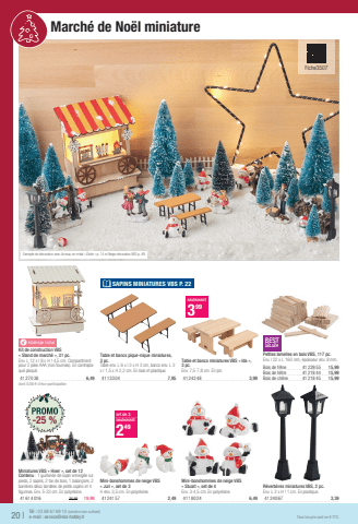 Exemple de d%u00e9coration avec Anneau en m%u00e9tal %u00ab %u00c9toile %u00bb p. 14 et Neige d%u00e9corative VBS p. 49.T%u00e9l : 03 69 61 69 10 (num%u00e9ro non surtax%u00e9)20 |e-mail : service@vbs-hobby.frTous les prix sont en %u20ac TTC. March%u00e9 de No%u00ebl miniature y%u00e9clairage inclusKit de construction VBS %u00ab Stand de march%u00e9 %u00bb, 31 pc.Env. L 12 x l 8 x H 14,5 cm. Compartiment pour 2 piles AAA (non fournies). En contreplaqu%u00e9 plaqu%u00e9.41270 386,49dont 0,06 %u20ac d'%u00e9co-participationBESTSELLERPetites lamelles en bois VBS, 117 pc.Env. l 22 x L 160 mm, %u00e9paisseur env. 8 mm.Bois de fr%u00eane41229 5515,99Bois de h%u00eatre41218 4415,99Bois de ch%u00eane41218 4515,99Table et bancs pique-nique miniatures, 3 pc.Table env. L 6 x l 3 x H 3 cm, bancs env. L 3 x l 1,5 x H 2,2 cm. En bois et plastique.41133 047,95R%u00e9verb%u00e8res miniatures VBS, 2 pc.Env. L 2 x H 11 cm. En plastique.41240 673,39Miniatures VBS %u00ab Hiver %u00bb, set de 12Contenu : 1 guirlande de sapin enneig%u00e9e sur pieds, 2 sapins, 2 tas de bois, 1 balan%u00e7oire, 2 barri%u00e8res d%u00e9co bord%u00e9es de petits sapins et 4 fi gurines. Env. 5-23 cm. En polyr%u00e9sine.41614 01626,9919,99Mini-bonshommes de neige VBS %u00ab Juri %u00bb, set de 3H env. 3,5 cm. En polyr%u00e9sine.41241 572,49set de 3seulement249Table et bancs miniatures VBS %u00ab Ida %u00bb, 3 pc.Env. 7,5-7,8 cm. En pin.41242 483,99seulement399Fiche3507SAPINS MINIATURES VBS P. 22 Mini-bonshommes de neige VBS %u00ab Stuart %u00bb, set de 4Env. 3-4,5 cm. En polyr%u00e9sine.41180 246,49-25 %