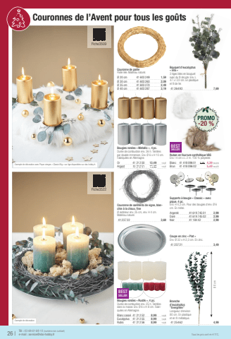 Exemple de d%u00e9coration avec Pique-cierges %u00ab Classic Big %u00bb sur tige disponibles sur vbs-hobby.fr.T%u00e9l : 03 69 61 69 10 (num%u00e9ro non surtax%u00e9)26 |e-mail : service@vbs-hobby.frTous les prix sont en %u20ac TTC.Exemple de d%u00e9corationCouronne de paillePaille li%u00e9e. Mat%u00e9riau naturel.%u00d8 20 cm41603 2491,59%u00d8 30 cm41603 2632,09%u00d8 35 cm41603 2702,49%u00d8 40 cm41603 2873,19Bouquet d'eucalyptus %u00ab Ella %u00bb3 tiges li%u00e9es en bouquet avec du fi l de jute. Env. L 47 x l 22 cm. En plastique et fi l de fer.41264 937,69Bougies rondes %u00ab Metallic %u00bb, 4 pc.Dur%u00e9e de combustion env. 36 h. Teint%u00e9es par double immersion. Env. %u00d8 6 x H 10 cm. Fabriqu%u00e9es en Allemagne.Or41212 5013,491=3,37Argent41212 5113,491=3,37BESTSELLERRuban en fourrure synth%u00e9tique VBSEnv. l 4 cm x L 2 m. 100 % polyester. Blanc41418 096 015,494,391m=2,19Argent41212 5113,49Brun41418 096 025,491m=2,75Couronne de sarments de vigne, blanchie %u00e0 la chaux, fi ne%u00d8 ext%u00e9rieur env. 25 cm, env. H 4 cm. Mat%u00e9riau naturel.41237 223,69Coupe en zinc %u00ab Plat %u00bbEnv. %u00d8 32 x H 2,3 cm. En zinc.41237 213,49BESTSELLERBougies rondes %u00ab Rustik %u00bb, 4 pc.Dur%u00e9e de combustion env. 25 h. Teint%u00e9es dans la masse. Env. %u00d8 6 x H 8 cm. Fabriqu%u00e9es en Allemagne.Blanc cass%u00e941212 528,991=2,25Eucalyptus41212 558,991=2,25Rubis41212 568,991=2,25Branche d'eucalyptus \Longueur d'environ 80 cm. En plastique et en fi l m%u00e9tallique.41254 624,99 Couronnes de l%u2019Avent pour tous les go%u00fbts 80 cm Fiche3509Fiche3522Supports %u00e0 bougie %u00ab Classic %u00bb avec pique, 4 pc.Env. H 4,3 cm. Pour des bougies d'env. %u00d8 6 cm. En m%u00e9tal.Argent%u00e941619 745 012,99Dor%u00e941619 745 022,99Noir41184 422,99-20 %