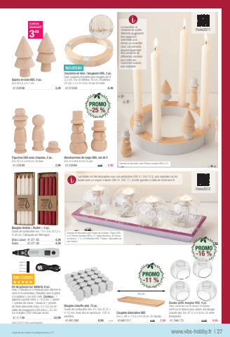 www.vbs-hobby.frL%u00e9gende des ic%u00f4nes & pictogrammes p. 57| 27Exemple de d%u00e9coration avec Peinture acrylique VBS p. 47.Sapins en bois VBS, 2 pc.Env. %u00d8 4,5 x H 7 cm.41239 883,492 pi%u00e8cesseulement349NOUVEAUCouronne en bois / bougeoirs VBS, 4 pc.Avec supports encastr%u00e9s pour bougies de %u00d8 2,2 cm.Env. %u00d8 int%u00e9rieur 16 cm, %u00d8 ext%u00e9rieur 22 cm, L 3 x H 3 cm. En pin et m%u00e9tal.41270 088,49Bonshommes de neige VBS, set de 2Env. H 5 et 6,8 cm. En pin.41239 863,992,99Bougies droites %u00ab Rustik %u00bb, 4 pc.Dur%u00e9e de combustion env. 10 h. Env. %u00d8 2,2 x H 25 cm. Fabriqu%u00e9es en Allemagne.Blanc cass%u00e941271 834,29Rubis41271 844,29Boules porte-bougies VBS, 4 pc.Avec ouverture sur le devant. Emplacement sur le dessus pour placer une bougie chauffe-plat. Env. %u00d8 10 x H 8 cm. En verre transparent.41766 17311,959,95Figurines VBS avec chapeau, 2 pc.Env. %u00d8 2,5 x H 8 cm. En bois.41239 892,99Coupelle d%u00e9corative VBSEnv. L 39 x l 14,5 x H 2,8 cm. En %u00e9pic%u00e9a.41697 2174,493,99Bougies chauffe-plat, 75 pc.Dur%u00e9e de combustion%u00a0env. 4 h. Env. %u00d8 37 x H 15 mm. Avec %u00e9tui en aluminium. 100 % paraffi ne.41491 2808,991=0,12AVIS%u00a0CLIENTSxxxxxKit de gravure sur batterie, 6 pc.Avec 3 vitesses et 4 embouts pour d%u00e9corer le verre et la c%u00e9ramique. Utilisation sans fi l gr%u00e2ce %u00e0 la batterie Li-ion 600 mAh. Contenu : 1 appareil %u00e0 graver d'env. L 14,6 cm, 1 pointe, 1 cylindre de meule, 1 boule et 1 cylindre de fraise diamant%u00e9e d'env. 3,2-3,5 cm et 1 c%u00e2ble de chargement USB d'env. L 57 cm. (Le chargeur USB n'est pas inclus).41117 6632,99dont 0,02 %u20ac d'%u00e9co-participationExemple de d%u00e9coration avec Poudre de moulage %u00ab Raysin 200 %u00bb p. 9, Peinture acrylique VBS p. 47, Neige diamant p. 49, Moule en silicone %u00ab 1-0 %u00bb et Perforatrice VBS %u00ab %u00c9toiles %u00bb disponibles sur vbs-hobby.fr.Fiche3511Fiche3512La couronne se compose de quatre %u00e9l%u00e9ments qui peuvent %u00eatre facilement assembl%u00e9s pour former un ensemble rond. Les %u00e9l%u00e9ments peuvent %u00e9galement %u00eatre combin%u00e9s de diff%u00e9rentes mani%u00e8res pour cr%u00e9er des couronnes toujours plus originales.Les %u00e9toiles ont %u00e9t%u00e9 d%u00e9coup%u00e9es avec une perforatrice (R%u00e9f. 41 544 313), puis report%u00e9es sur les boules avec un crayon %u00e0 dessin (R%u00e9f. 41 205 71), et enfi n grav%u00e9es %u00e0 l'aide de l'outil sans fi l. 39 cm -11 %-16 %Boules porte-bougies VBS, 4 pc.Avec ouverture sur le devant. Emplace--25 %