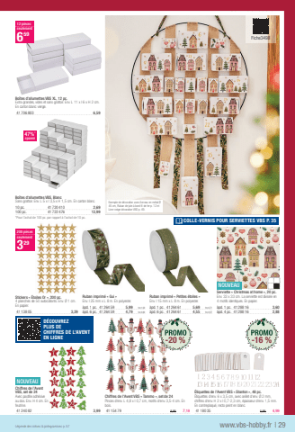 Bo%u00eetes d'allumettes VBS, BlancSans grattoir. Env. L 5 x l 3,5 x H 1,5 cm. En carton blanc.10 pc.41720 4102,69100 pc.41722 47613,99*Pour l'achat de 100 pc. par rapport %u00e0 l'achat de 10 pc.Bo%u00eetes d%u2019allumettes VBS XL, 12 pc.Extra grandes, vides et sans grattoir. Env. L 11 x l 6 x H 2 cm. En carton blanc vierge.41706 8036,5947%*sparen12 pi%u00e8cesseulement659Schmuckbastelnwww.vbs-hobby.frL%u00e9gende des ic%u00f4nes & pictogrammes p. 57| 29Exemple de d%u00e9coration avec Anneau en m%u00e9tal %u00d8 45 cm, Ruban de jute %u00e0 bord fi l de fer p. 12 et Liner neige d%u00e9corative VBS p. 49.Stickers %u00ab %u00c9toiles Or %u00bb, 200 pc.4 planches de 50 autocollants. Env. %u00d8 1 cm. En papier.41138 053,29200 pi%u00e8cesseulement329Ruban imprim%u00e9 %u00ab Gui %u00bbEnv. l 25 mm x L 8 m. En polyester.%u00e0pd. 1 pc.41264 595,991m=1,00%u00e0pd. 6 pc.41264 594,791m=0,80Ruban imprim%u00e9 %u00ab Petites %u00e9toiles %u00bbEnv. l 15 mm x L 8 m. En polyester.%u00e0pd. 1 pc.41264 615,691m=0,71%u00e0pd. 6 pc.41264 614,551m=0,57NOUVEAUServiette %u00ab Christmas at home %u00bb, 20 pc.Env. 33 x 33 cm. La serviette est divis%u00e9e en 4 motifs identiques. En papier.%u00e0pd. 1 pc.41288 163,60%u00e0pd. 4 pc.41288 162,88NOUVEAUChiffres de l%u2019Avent VBS, set de 24Avec pastille adh%u00e9sive au dos. Env. H 4 cm. En feutrine.41240 823,99Chiffres de l'Avent VBS %u00ab Tammo %u00bb, set de 24Pinces d'env. L 4,8 x l 0,7 cm, motifs d'env. 3,5-4 cm. En bois.41154 798,997,19%u00c9tiquettes de l'Avent VBS %u00ab Stanton %u00bb, 48 pc.%u00c9tiquettes d'env. 6 x 3,5 cm, avec %u0153illet d'env. %u00d8 2 mm, chiffres d'env. H 2 x l 0,7-2,3 cm, %u00e9paisseur d'env. 1,5 mm. En contreplaqu%u00e9, recto peint en blanc.41180 355,994,99COLLE-VERNIS POUR SERVIETTES VBS P. 35 Fiche3498 D%u00c9COUVREZPLUS DECHIFFRES DE L%u2019AVENTEN LIGNE -20 %-16 %