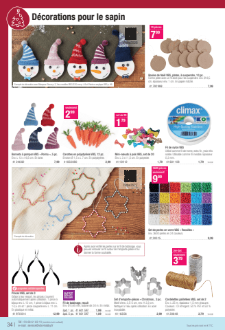 Exemple de d%u00e9coration avec Marqueur Posca p. 2, Yeux mobiles VBS %u00d8 20 mm p. 44 et Peinture acrylique VBS p. 46.Boules de No%u00ebl VBS, plates, %u00e0 suspendre, 10 pc.Forme plate avec un fi l dor%u00e9 pour les suspendre. Env. %u00d8 8,5 cm, %u00e9paisseur env. 1 cm. En papier m%u00e2ch%u00e9.41792 9987,99Set de perles en verre VBS %u00ab Rocailles %u00bbEnv. 3600 perles en 24 couleurs.41240 159,9910 pi%u00e8ces7993600 pi%u00e8cesseulement999T%u00e9l : 03 69 61 69 10 (num%u00e9ro non surtax%u00e9)34 |e-mail : service@vbs-hobby.frTous les prix sont en %u20ac TTC.Exemple de d%u00e9corationBonnets %u00e0 pompon VBS %u00ab Pointu %u00bb, 5 pc.Env. L 13 x l 6,5 cm. En laine.41246 827,99Fil de nylon VBSUtilis%u00e9 comme fi l de trame, extra fi n, mais tr%u00e8s solide. Utilisable comme fi l invisible. %u00c9paisseur 0,3 mm.41601 1081,791m=0,02Carottes en polystyr%u00e8ne VBS, 12 pc.Environ %u00d8 1,5 x L 7 cm. En polystyr%u00e8ne.41833 0802,99seulement299Mini-n%u0153uds %u00e0 pois VBS, set de 20Env. L 3 x l 1,5 cm. En polyester.41139 121,79set de 20179Set d'emporte-pi%u00e8ces %u00ab Christmas , 3 pc.Motif d'env. 3,5-5 cm, env. H 2,3 cm. Nettoyer %u00e0 l'eau apr%u00e8s utilisation. En acier inoxydable.41163 562,99BESTSELLERFil de bobinage, recuitEnv. %u00d8 0,65 mm, bobine de 34 m. En m%u00e9tal.%u00e0pd. 1 pc.41601 5971,991m=0,06%u00e0pd. 5 pc.41601 5971,091m=0,03ypoign%u00e9es antid%u00e9rapantesPinces VBS, set de 3Gr%u00e2ce %u00e0 leur ressort, les pinces s'ouvrent automatiquement apr%u00e8s utilisation. 1 pince %u00e0 bijoux env. L 12 cm, 1 pince %u00e0 bijoux env. L 14,5 cm et 1 pince coupante env. L 11 cm. En plastique et m%u00e9tal.41970 01412,99Cordelettes paillet%u00e9es VBS, set de 2Env. L 25 m, %u00e9paisseur 1,5 mm chacune. Couleurs : Or et Argent. 50 % PET et 50 % polyester.41206 483,791m=0,082er-Setseulement379 D%u00e9corations pour le sapin Apr%u00e8s avoir enfi l%u00e9 les perles sur le fi l de bobinage, vous pouvez enrouler ce fi l autour de l'emporte-pi%u00e8ce et lui donner la forme souhait%u00e9e.Fiche3528Fiche3527