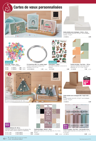 Exemple de d%u00e9corationT%u00e9l : 03 69 61 69 10 (num%u00e9ro non surtax%u00e9)40 |e-mail : service@vbs-hobby.frTous les prix sont en %u20ac TTC.Cartes doubles avec enveloppes %u00ab Cr%u00e8me %u00bb, 50 pc.50 cartes doubles, format A6, 220 g/m%u00b2, avec enveloppes assorties, 110 g/m%u00b2.41268 258,99BESTSELLERPastilles adh%u00e9sives 3D, 400 pc.Autocollants double-face en caoutchouc de cellulose. Pour cr%u00e9er des motifs en relief en carterie ou scrapbooking.5 x 5 x 1 mm41567 206 021,295 x 5 x 2 mm41567 206 061,29Cartes doubles avec enveloppes VBS %u00ab Papier kraft %u00bb, 50 pc.50 cartes doubles, format A6, 240 g/m%u00b2, avec enveloppes assorties, 120 g/m%u00b2.41268 246,99b50 pi%u00e8cesseulement699Feuilles de pliage %u00ab Natural %u00bb, 60 pc.Motifs vari%u00e9s imprim%u00e9s sur les deux faces. Env. 15 x 15 cm, 80 g/m%u00b2.41243 619,491m%u00b2=7,03BESTSELLERFeuilles de pliage %u00ab Duo-Color %u00bb, tons poudr%u00e9s, 60 pc.Couleurs vari%u00e9es imprim%u00e9es sur les deux faces. Env. 15 x 15 cm, 80 g/m%u00b2.41194 158,991m%u00b2=6,66NOUVEAUPerles VBS %u00ab %u00c9toiles %u00bb, 40 g%u00d8 du trou env. 1 mm. En plastique.10 mm41268 411,991kg=49,7515 mm41268 421,991kg=49,75Fil d'aluminium VBS, 3 m, couleur argentFil facile %u00e0 courber pour les bijoux et les d%u00e9corations. Env. %u00d8 2 mm.41672 085 011,191m=0,40NOUVEAUAutocollants %u00ab X-Mas %u00bbAvec effet 3D. Motifs de 1,6-6,5 cm. En plastique.41274 003,99Feuilles de pliage %u00ab Duo Color %u00bb, 100 pc.Impression recto/verso dans des couleurs diff%u00e9rentes. Env. 15 x 15 cm, 70 g/m%u00b2.41242 907,491m%u00b2=3,33Exemple de d%u00e9coration avec Mini-%u00e9toiles VBS %u00ab Witney %u00bb p. 13. Cartes de v%u0153ux personnalis%u00e9es Utilisez la planche %u00e0 plier multifonctionnelle p. 41 pour gaufrer des lignes r%u00e9guli%u00e8res sur le papier. Vous obtiendrez ainsi facilement de beaux plis nets.Fiche3518Fiche3519