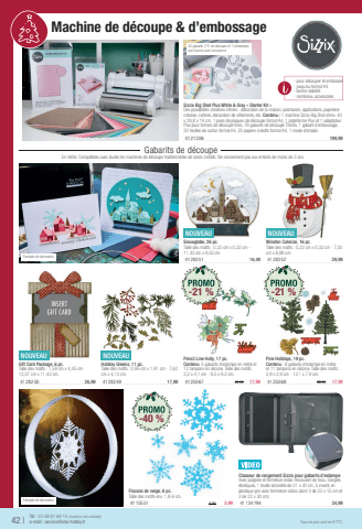 Sizzix Big Shot Plus White & Gray %u00ab Starter Kit %u00bbDes possibilit%u00e9s cr%u00e9atives infi nies : d%u00e9coration de la maison, patchwork, applications, papeterie cr%u00e9ative, carterie, d%u00e9coration de v%u00eatements, etc. Contenu : 1 machine Sizzix Big Shot d'env. 40 x 29,8 x 19 cm, 1 paire de plaques de d%u00e9coupe format A4, 1 plateforme Plus et 1 adaptateur Plus pour formes de d%u00e9coupe fi nes, 19 gabarits de d%u00e9coupe Thinlits, 1 gabarit d'embossage, 20 feuilles de carton format A4, 20 papiers cr%u00e9atifs format A4, 1 mode d'emploi.41213 06199,99Flocons de neige, 6 pc.Taille des motifs env. 1,8-6 cm.41155 519,995,99Classeur de rangement Sizzix pour gabarits d'estampeAvec poign%u00e9e et fermeture %u00e9clair. Recouvert de tissu. Sangles %u00e9lastiques, 1 feuille aimant%u00e9e de 21 x 30 cm, 5 inserts en plastique gris avec fermeture velcro (dont 3 de 22 x 15 cm et 2 de 22 x 30 cm).41134 19434,99T%u00e9l : 03 69 61 69 10 (num%u00e9ro non surtax%u00e9)42 |e-mail : service@vbs-hobby.frTous les prix sont en %u20ac TTC.NOUVEAUGift Card Package, 6 pc.Taille des motifs : 1,59 cm x 4,45 cm - 12,07 cm x 11,43 cm.41282 5026,99NOUVEAUWinston Colorize, 16 pc.Taille des motifs : 0,32 cm x 0,32 cm - 7,30 cm x 8,89 cm.41282 5229,99Pencil Line Holly, 17 pc.Contenu: 5 gabarits d'estampe en m%u00e9tal et 12 tampons en silicone. Taille des motifs : 3,2 x 4,1 cm - 9,5 x 9,2 cm.41250 6722,9917,99NOUVEAUSnowglobe, 26 pc.Taille des motifs : 0,32 cm x 0,32 cm - 11,43 cm x 9,53 cm41282 5116,49NOUVEAUHoliday Greens, 11 pc.Taille des motifs : 0,95 cm x 1,91 cm - 7,62 cm x 4,13 cm.41282 4917,99Pine Holidays, 19 pc.Contenu : 8 gabarits d'estampe en m%u00e9tal et 11 tampons en silicone. Taille des motifs : 2,9 x 2,9 cm - 12,1 x 7,9 cm.41250 6822,9917,9920 gabarits (19 de d%u00e9coupe et 1 d'estampe) sont fournis avec la machine.Exemple de d%u00e9corationExemple de d%u00e9coration Machine de d%u00e9coupe & d%u2019embossage Gabarits de d%u00e9coupe En m%u00e9tal. Compatibles avec toutes les machines de d%u00e9coupe traditionnelles de loisirs cr%u00e9atifs. Ne conviennent pas aux enfants de moins de 3 ans.- pour d%u00e9couper et embosser- jusqu'au format A4- bonne stabilit%u00e9- nombreux accessoires-40 %-21 %-21 %