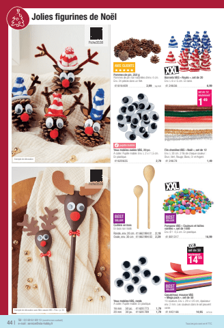 Exemple de d%u00e9corationFiche3538T%u00e9l : 03 69 61 69 10 (num%u00e9ro non surtax%u00e9)44 |e-mail : service@vbs-hobby.frTous les prix sont en %u20ac TTC.BESTSELLERCaoutchouc mousse VBS %u00ab Mega pack %u00bb, set de 5010 couleurs. Env. L 29 x l 20 cm, %u00e9paisseur env. 2 mm. Les couleurs dans le set peuvent varier.41443 16614,951m%u00b2=5,16bset de 50seulement1495BESTSELLERCuill%u00e8re en boisEn bois non trait%u00e9.Ronde, env. 20 cm41662 994 012,19Ovale, env. 30 cm41662 994 032,29BESTSELLERPompons VBS %u00ab Couleurs et tailles vari%u00e9es %u00bb, set de 1000Env. %u00d8 1-4,5 cm. En plastique.41801 31716,99AVIS%u00a0CLIENTSxxxxxPommes de pin, 250 gPommes de pin noir naturelles d'env. 4 cm. Env. 24 pi%u00e8ces dans un fi let.41616 4093,991kg=19,95Bonnets VBS %u00ab Ray%u00e9s %u00bb, set de 20Env. L 6 x l 5 cm. En laine.41246 566,99ypupille mobileYeux mobiles ovales VBS, 20 pc.%u00c0 coller. Pupille mobile. Env. L 2 x l 1,5 cm. En plastique.41620 6352,79Fils chenilles VBS %u00ab No%u00ebl %u00bb, set de 12Env. L 30 cm. 2 fi ls de chaque couleur : Brun, Vert, Rouge, Blanc, Or et Argent.41246 781,49set de 12seulement149Exemple de d%u00e9coration avec Mini-n%u0153uds VBS %u00ab Pois %u00bb p. 34. Jolies fi gurines de No%u00ebl Yeux mobiles VBS, ronds%u00c0 coller. Pupille mobile. En plastique.16 mm50 pc.41620 7731,7920 mm30 pc.41620 7891,79Fiche3539