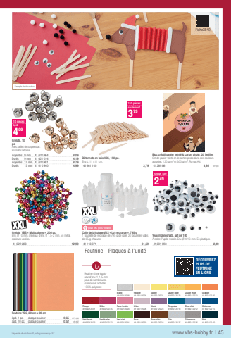 Feutrine VBS, 20 cm x 30 cm%u00e0pd. 1 pc.chaque couleur0,651m%u00b2=10,83%u00e0pd. 10 pc.chaque couleur0,521m%u00b2=8,67www.vbs-hobby.frL%u00e9gende des ic%u00f4nes & pictogrammes p. 57| 45Exemple de d%u00e9corationBlancPoudr%u00e9JauneJaune dor%u00e9Jaune maisOrange41650 120 3841650 120 0841650 120 2141650 120 2241650 120 2341650 120 25RougeM%u00fbreRose tendreLilasVioletTurquoiseBleu clairOutremer41650 120 4141650 120 4541650 120 0441650 120 2641650 120 2441650 120 1841650 120 1241650 120 15Vert fonc%u00e9Vert herbeVert clairBrunBrun clairGrisGris sourisNoir41650 120 3341650 120 3241650 120 3141650 120 3041650 120 3441650 120 3741650 120 3641650 120 40B%u00e2tonnets en bois VBS, 150 pc.Env. L 11 x l 1 cm. 41661 1403,79150 pi%u00e8cesseulement379Grelots, 10 pc.Avec %u0153illet de suspension. En m%u00e9tal laitonn%u00e9.Argent%u00e9s9 mm41620 8644,09Dor%u00e9s9 mm41621 0144,19Argent%u00e9s15 mm41620 9014,79Dor%u00e9s15 mm41610 9404,9910 pi%u00e8ces%u00e0pd.409Grelots VBS %u00ab Multicolores %u00bb, 200 pc.Env. %u00d8 10 mm, anneaux d'env. %u00d8 1,5-2 mm. En m%u00e9tal, couleurs vari%u00e9es.41622 28812,99Yeux mobiles VBS, set de 100%u00c0 coller. Pupille mobile. Env. %u00d8 4-16 mm. En plastique.41601 0932,49set de 100249Bloc cr%u00e9atif papier teint%u00e9 & carton photo, 20 feuillesSet de papier teint%u00e9 et de carton photo dans des couleurs assorties. 130 g/m%u00b2 et 300 g/m%u00b2. Format A4.41269 864,951m%u00b2=3,96ypour les gros usagesColle de bricolage VBS %u00ab Lot recharge %u00bb, 795 g1 bouteille de recharge de 795 g de colle, 20 bouteilles vides de 85 g chacune.41118 07131,59 Feutrine - Plaques %u00e0 l%u2019unit%u00e9 D%u00c9COUVREZPLUS DE FEUTRINEEN LIGNE Feutrine d'une %u00e9paisseur d'env. 1-1,5 mm, pour de nombreuses cr%u00e9ations et activit%u00e9s. 100% polyester.Fiche3540