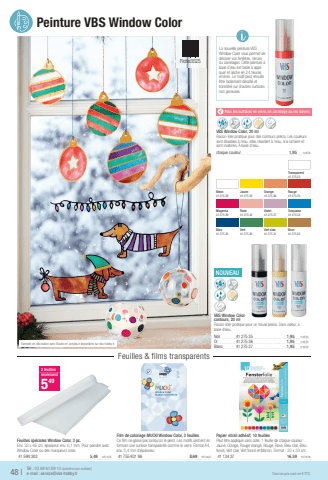 NOUVEAUVBS Window Color contours, 20 mlFlacon-liner pratique pour un travail pr%u00e9cis. Sans odeur, %u00e0 base d'eau.Noir41275 351,951l=97,50Or41275 361,951l=97,50Blanc41275 371,951l=97,50Feuilles sp%u00e9ciales Window Color, 3 pc.Env. 33 x 46 cm, %u00e9paisseur env. 0,1 mm. Pour peindre avec Window Color ou des marqueurs craie.41590 3035,491m%u00b2=15,25Film de coloriage MUCKI Window Color, 3 feuillesCe fi lm ne glisse pas lorsqu'on le peint. Les motifs s%u00e8chent en formant une surface transparente comme le verre. Format A4, env. 0,4 mm d'%u00e9paisseur.41755 931 968,691m%u00b2=46,47Papier vitrail adh%u00e9sif, 10 feuillesPeut %u00eatre appliqu%u00e9 sans colle. 1 feuille de chaque couleur : Jaune, Orange, Rouge orang%u00e9, Rouge, Rose, Bleu clair, Bleu fonc%u00e9, Vert clair, Vert fonc%u00e9 et Marron. Format : 23 x 33 cm.41134 3716,591m%u00b2=21,863 feuillesseulement549T%u00e9l : 03 69 61 69 10 (num%u00e9ro non surtax%u00e9)48 |e-mail : service@vbs-hobby.frTous les prix sont en %u20ac TTC.Exemple de d%u00e9coration avec Boules en acrylique disponibles sur vbs-hobby.fr. Peinture VBS Window Color yPour les surfaces en verre, en carrelage ou les miroirsVBS Window Color, 20 mlFlacon-liner pratique pour des contours pr%u00e9cis. Les couleurs sont diluables %u00e0 l'eau, elles r%u00e9sistent %u00e0 l'eau, %u00e0 la lumi%u00e8re et sont inodores. %u00c0 base d'eau.chaque couleur1,951l=97,50Transparent41275 23BlancJauneOrangeRouge41275 2841275 2441275 2641275 33MagentaRoseVioletTurquoise41275 2941275 3241275 2741275 34BleuVertVert clairBrun41275 2541275 3041275 3141275 22 Feuilles & films transparents La nouvelle peinture VBS Window Color vous permet de d%u00e9corer vos fen%u00eatres, miroirs ou carrelages. Cette peinture %u00e0 base d'eau est facile %u00e0 appliquer et s%u00e8che en 24 heures environ. Le motif peut ensuite %u00eatre facilement d%u00e9coll%u00e9 et transf%u00e9r%u00e9 sur d'autres surfaces non poreuses.Fiche3525