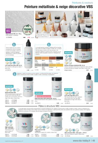 Exemple de d%u00e9coration avec Moule en silicone VBS %u00ab Gnome %u00bb p. 8 et Poudre de moulage Kerafl ott p. 9.Fiche3534NOUVEAUNeige d%u00e9corative VBSP%u00e2te structur%u00e9e blanche %u00e0 gros grains qui permet de cr%u00e9er des effets de surface avec une structure, comme la neige. Sans odeur, %u00e0 base d'eau.100 ml41278 693,491l=34,90230 ml41278 706,591l=28,651000 ml41278 7115,991l=15,99NOUVEAULiner effet neige VBS, 80 mlP%u00e2te textur%u00e9e blanche facile %u00e0 appliquer avec le fl acon liner. Pour des effets ressemblant %u00e0 la neige. Sans odeur, %u00e0 base d'eau.41278 723,491l=34,90NOUVEAULiner effet givr%u00e9 blanc VBS, 20 mlPour donner un effet givr%u00e9 ou sabl%u00e9. %u00c0 base d'eau.41278 742,491l=124,50P%u00e2te %u00e0 structure VBS %u00ab Gros grain %u00bbP%u00e2te blanche %u00e0 gros grains. Inodore, %u00e0 base d'eau.230 ml41275 495,991l=26,041000 ml41275 5014,991l=14,99P%u00e2te %u00e0 structure VBS %u00ab Grain fi n %u00bbP%u00e2te blanche %u00e0 grains fi ns. Inodore, %u00e0 base d'eau.230 ml41275 515,991l=26,041000 ml41275 5214,991l=14,99P%u00e2te %u00e0 structure VBS %u00ab Sans grain %u00bb, 230 mlP%u00e2te lisse et blanche. Inodore, %u00e0 base d'eau.41275 535,991l=26,04Peintures & couleurswww.vbs-hobby.frL%u00e9gende des ic%u00f4nes & pictogrammes p. 57| 49BESTSELLERNeige diamant VBS, env. 100 gEffets paillet%u00e9s. En plastique.41436 8923,292,391kg=23,90NOUVEAUyconvient aussi pour le verreNeige d%u00e9corative effet paillet%u00e9 VBS, 100 mlP%u00e2te structur%u00e9e blanche avec paillettes scintillantes. %u00c0 base d'eau.41278 734,991l=49,90NOUVEAUPeinture acrylique m%u00e9tallis%u00e9e VBS, 50 mlPeinture couvrante %u00e0 forte teneur en pigments. Apr%u00e8s s%u00e9chage, le rendu est brillant et m%u00e9tallis%u00e9. Sans odeur, %u00e0 base d'eau.chaque couleur5,391l=107,80Cuivre antiqueBronzeBronze antiqueGraphite41278 6541278 6341278 6441278 68ArgentArgent antiqueOr antiqueOr41278 6641278 6741278 6241278 61Peinture id%u00e9ale pour les surfaces transparentes comme l'acrylique, le verre et les feuilles ou fi lms en plastique. Il suffi t de l'appliquer d%u00e9licatement %u00e0 l'aide d'un pinceau ou d'une %u00e9ponge. P%u00e2tes %u00e0 structure VBS Peinture m%u00e9tallis%u00e9e & neige d%u00e9corative VBS La nouvelle peinture acrylique m%u00e9tallis%u00e9e VBS est parfaite pour le bois, les %u00e9toiles, le papier, le m%u00e9tal, etc. La surface doit %u00eatre propre et s%u00e8che, sans trace de gras ni de poussi%u00e8re. Appliquez la peinture avec un pinceau ou une %u00e9ponge. Cr%u00e9ez vos propres nuances en m%u00e9langeant les couleurs !La nouvelle p%u00e2te %u00e0 structure VBS est polyvalente et convient parfaitement aux mat%u00e9riaux comme le bois, le MDF, le papier, le carton, la toile, la c%u00e9ramique et le polystyr%u00e8ne. Apr%u00e8s s%u00e9chage, dont le temps varie en fonction de l'application, la p%u00e2te peut %u00eatre peinte sans probl%u00e8me avec de la peinture acrylique. Elle s'applique facilement au pinceau ou %u00e0 la spatule, elle est inodore et r%u00e9siste %u00e0 la lumi%u00e8re.Appliquez %u00e0 l'aide d'un pinceau ou d'une spatule. La surface doit %u00eatre propre, non grasse et s%u00e8che. Convient pour le bois, le MDF, le papier, la toile, la c%u00e9ramique, le polystyr%u00e8ne.-27 %