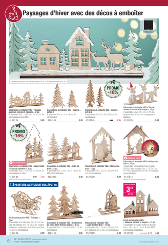 Exemple de d%u00e9coration avec Peinture acrylique VBS p. 47 et Neige d%u00e9corative VBS p. 49.T%u00e9l : 03 69 61 69 10 (num%u00e9ro non surtax%u00e9)6 |e-mail : service@vbs-hobby.frTous les prix sont en %u20ac TTC.-16%D%u00e9corations %u00e0 embo%u00eeter VBS %u00ab Sapins %u00bb, set de 2%u00c0 assembler. Env. H 13 et 18 cm. En contreplaqu%u00e9.41241 223,49D%u00e9coration %u00e0 embo%u00eeter VBS %u00ab Luge du P%u00e8re No%u00ebl %u00bb, 10 pc.%u00c0 assembler. Env. L 13,5 x l 5,5 x H 15,5 cm, %u00e9paisseur env. 5 mm. En contreplaqu%u00e9.41270 093,49D%u00e9coration %u00e0 embo%u00eeter VBS %u00ab Paysage avec ses rennes et maisons %u00bb, 2 pc.%u00c0 assembler. Env. L 29,5 x l 3 x H 12 cm. En contreplaqu%u00e9 et bois MDF.41241 163,95y%u00e9clairage inclusD%u00e9coration %u00e0 embo%u00eeter VBS %u00ab Maison de lutin %u00bb, 10 pc.%u00c0 assembler. Compartiment pour 2 piles CR2032 (non incluses). Env. L 17,5 x l 5 x H 19 cm, %u00e9paisseur env. 4 mm. En contreplaqu%u00e9 et plastique.41270 116,49dont 0,02 %u20ac d'%u00e9co-participationD%u00e9coration %u00e0 embo%u00eeter VBS %u00ab Maison de lutin %u00bb, 5 pc.%u00c0 assembler. Env. L 12,5 x l 4,5 x H 18,5 cm. En contreplaqu%u00e9.41270 394,29D%u00e9coration %u00e0 embo%u00eeter VBS %u00ab Lutin de No%u00ebl %u00bb, 5 pc.%u00c0 assembler. Env. L 24 x l 4 x H 19 cm. En MDF et contreplaqu%u00e9.41270 104,49D%u00e9coration %u00e0 embo%u00eeter VBS %u00ab Bonhomme de neige dans for%u00eat de sapins %u00bb, 8 pc.%u00c0 assembler. Env. L 22,5 x l 5 x H 21 cm. En contreplaqu%u00e9.41241 764,95Kit de construction VBS %u00ab Tra%u00eeneau %u00bb, 7 pc.%u00c0 assembler et %u00e0 coller. Env. 18 x 8 x 12 cm. Taille de l'int%u00e9rieur env. 7,5 x 6,5 cm. Hauteur int%u00e9rieure %u00e0 l'arri%u00e8re env. 9 cm et %u00e0 l'avant env. 7,5 cm. En contreplaqu%u00e9.41207 303,99Fiche3102D%u00e9coration %u00e0 embo%u00eeter VBS %u00ab Trio de rennes %u00e0 bonnet et %u00e9charpe %u00bb, 13 pc.%u00c0 assembler. Env. L 31 x l 4 x H 18 cm, %u00e9paisseur env. 6 mm. En contreplaqu%u00e9 et plastique.41270 255,49Kit de construction VBS %u00ab Maisons de No%u00ebl et sapins %u00bb, 12 pc.%u00c0 assembler et %u00e0 coller (colle non fournie). Env. L 18 x l 6 x H 13 cm. En bois MDF, contreplaqu%u00e9 et plastique.41241 09novembre 3,194,69D%u00e9corations %u00e0 embo%u00eeter VBS %u00ab Sapins %u00bb, set de 2%u00c0 assembler. Env. H 21,5 et 28,5 cm. En contreplaqu%u00e9.41241 755,954,95 PEINTURE ACRYLIQUE VBS %u00c0PD. 46 Paysages d%u2019hiver avec des d%u00e9cos %u00e0 embo%u00eeter y%u00e9clairage inclusD%u00e9coration %u00e0 embo%u00eeter VBS %u00ab Sapin m%u00e9tal %u2013 %u00c9clat de lumi%u00e8res %u00bb, 5 pc.%u00c0 assembler. Env. L 15 x l 5,5 x H 26 cm. En contreplaqu%u00e9 et m%u00e9tal.41241 408,997,49dont 0,02 %u20ac d'%u00e9co-participation-16%Star du mois319- 31 %