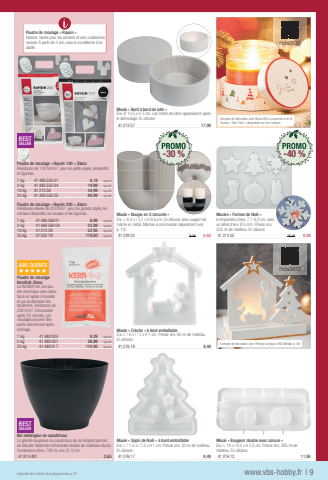 BESTSELLERPoudre de moulage %u00ab Raysin 100 %u00bb, BlancR%u00e9sistance de 120 N/mm%u00b2,pour les petits objets, pendentifs et fi gurines.1 kg41485 555 016,191kg=6,194 kg41485 555 0419,991kg=5,0010 kg41213 3644,991kg=4,5025 kg41485 555 2588,991kg=3,56Poudre de moulage %u00ab Raysin 200 %u00bb, BlancR%u00e9sistance %u00e9lev%u00e9e de 200 N/m%u00b2, pour les grands objets, les carreaux d%u00e9coratifs, les coupes et les fi gurines.1 kg41485 562 016,991kg=6,994 kg41485 562 0423,991kg=6,0010 kg41213 3852,951kg=5,2925 kg41252 19119,001kg=4,76AVIS%u00a0CLIENTSxxxxxPoudre de moulage Kerafl ott, BlancLa Kerafl ott est une poudre c%u00e9ramique sans odeur, facile et rapide %u00e0 travailler et qui se d%u00e9moule tr%u00e8s facilement. R%u00e9sistance de 200 N/m%u00b2. D%u00e9moulable apr%u00e8s 30 minutes. Les moulages peuvent %u00eatre peints directement apr%u00e8s s%u00e9chage.1 kg41480 0248,291kg=8,295 kg41480 03126,991kg=5,4025 kg41480 017110,001kg=4,40Moule %u00ab Cr%u00e8che %u00bb %u00e0 bord embo%u00eetableEnv. L 16 x l 13 x H 1 cm. Pr%u00e9voir env. 60 ml de mat%u00e9riau. En silicone.41276 188,49Moule %u00ab Bougeoir double avec rainure %u00bbEnv. L 16 x l 9,5 x H 2,5 cm. Pr%u00e9voir env. 285 ml de mat%u00e9riau. En silicone.41276 1311,95BESTSELLERBol m%u00e9langeur en caoutchoucLa grande souplesse du caoutchouc de ce r%u00e9cipient permet de d%u00e9coller facilement d'%u00e9ventuels r%u00e9sidus de mat%u00e9riaux durcis. Contenance d%u2019env. 700 ml, env. %u00d8 13 cm.41810 4012,65Moule %u00ab Sapin de No%u00ebl %u00bb %u00e0 bord embo%u00eetableEnv. L 11,5 x l 7,3 x H 1 cm. Pr%u00e9voir env. 30 ml de mat%u00e9riau. En silicone.41276 178,49www.vbs-hobby.frL%u00e9gende des ic%u00f4nes & pictogrammes p. 57| 9Moule %u00ab Bougie en U rainur%u00e9e %u00bbEnv. L 8,4 x l 3,7 x H 8,6 cm. En silicone, avec support de m%u00e8che en m%u00e9tal. M%u00e8ches %u00e0 commander s%u00e9par%u00e9ment (voir p. 10).41229 329,496,64Moules %u00ab Formes de No%u00ebl %u00bb6 empreintes d'env. 7,1-8,2 cm, avec un %u0153illet d'env. %u00d8 5 mm. Pr%u00e9voir env. 235 ml de mat%u00e9riau. En silicone.41210 5516,499,89Moule %u00ab Bord %u00e0 bord de lutin %u00bbEnv. %u00d8 13,5 x H 5 cm. Les motifs de lutins apparaissent apr%u00e8s le d%u00e9moulage. En silicone.41274 5717,99Exemple de d%u00e9coration avec Bocal VBS %u00e0 couvercle %u00e0 vis et Feutres %u00ab Twin Point %u00bb disponibles sur vbs-hobby.fr.Exemple de d%u00e9coration avec Peinture acrylique VBS Metallic p. 49.Fiche3472Fiche3532Poudre de moulage %u00ab Raysin %u00bbInodore, neutre pour les aliments et sans substances nocives. %u00c0 partir de 3 ans, sous la surveillance d'un adulte.-30 %-40 %