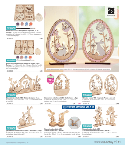 D%u00e9coration %u00e0 embo%u00eeter %u0153uf VBS %u00ab Ma%u00eetre lampe %u00bb, 9 pc.%u00c0 assembler, d%u00e9cor sur une face. Env. L 15,5 x H 20 cm, %u00e9paisseur env. 25 mm. En contreplaqu%u00e9.30227 824,493,49NOUVEAUD%u00e9coration %u00e0 embo%u00eeter VBS %u00ab Lapins %u00e0 la brouette %u00bb, 11 pc.%u00c0 assembler, d%u00e9cor sur une face. Env. L 18 x l 5 x H 20 cm. En contreplaqu%u00e9 plaqu%u00e9 et bois MDF.30288 282,95D%u00e9corations %u00e0 embo%u00eeter VBS %u00ab Lapins Bugs et Bea %u00bb, set de 2Pour chaque fi gurine, 3 pi%u00e8ces %u00e0 assembler et %u00e0 coller (colle non fournie). Env. %u00d8 8 x H 17 cm. En contreplaqu%u00e9 et rondin de bois.30227 554,99NOUVEAUMotifs VBS %u00ab %u0152ufs %u00bb avec peinture et pinceau, 21 pc.Contenu : 16 %u0153ufs en bois dans 4 motifs diff%u00e9rents, 4 godets de peinture et 1 pinceau. Env. L 5,5 x H 7,5 cm, %u00e9paisseur env. 2 mm. En contreplaqu%u00e9.30289 224,99NOUVEAUD%u00e9corations %u00e0 embo%u00eeter VBS %u00ab Couple de lapins avec des fl eurs %u00bb, set de 2%u00c0 assembler, d%u00e9cor sur une face. Env. L 11 x l 4,5 x H 18 cm. En contreplaqu%u00e9.30288 416,95NOUVEAUD%u00e9coration %u00e0 embo%u00eeter VBS %u00ab Maison de lapins %u00bb, 6 pc.%u00c0 assembler. Env. L 28 x l 5 x H 15 cm. En contreplaqu%u00e9 plaqu%u00e9 et bois MDF.30288 313,99NOUVEAUMotifs VBS %u00ab P%u00e2ques %u00bb avec peinture et pinceau, 29 pc.Contenu : 24 motifs en bois dans 6 designs diff%u00e9rents, 4 godets de peinture et 1 pinceau.Env. L 4 x H 6 cm, %u00e9paisseur env. 2 mm. En contreplaqu%u00e9.30289 205,99NOUVEAU%u0152uf d%u00e9co %u00e0 poser VBS %u00ab Lapins de P%u00e2ques %u00bb, set de 2%u00c0 assembler, d%u00e9cor sur une face. Env. L 14 x H 19 cm. En contreplaqu%u00e9.30288 186,49www.vbs-hobby.fr| 11L%u00e9gende des ic%u00f4nes & pictogrammes p. 33Exemple de d%u00e9coration avec Peinture acrylique VBS p. 15, Guirlande lumineuse micro-LED p. 24 et Polyphane VBS disponible sur vbs-hobby.fr.PEINTURE ACRYLIQUE VBS P. 15 Fiche3578- 22 %