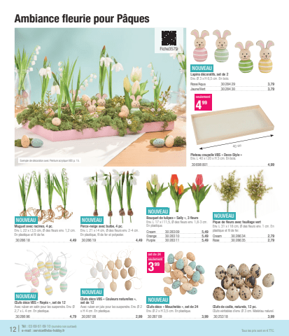 Plateau coupelle VBS %u00ab Deco-Style %u00bbEnv. L 40 x l 20 x H 3 cm. En bois.30698 8014,9912 |T%u00e9l : 03 69 61 69 10 (num%u00e9ro non surtax%u00e9)e-mail : service@vbs-hobby.frTous les prix sont en %u20ac TTC.Exemple de d%u00e9coration avec Peinture acrylique VBS p. 15.NOUVEAU%u0152ufs d%u00e9co VBS %u00ab Couleurs naturelles %u00bb, set de 12Avec ruban en jute pour les suspendre. Env. %u00d8 2 x H 4 cm. En plastique.30287 082,99NOUVEAU%u0152ufs d%u00e9co VBS %u00ab Ray%u00e9s %u00bb, set de 12Avec ruban en satin pour les suspendre. Env. %u00d8 2,7 x L 4 cm. En plastique.30286 964,79NOUVEAU%u0152ufs d%u00e9co %u00ab Mouchet%u00e9s %u00bb, set de 24Env. %u00d8 2 x H 3,5 cm. En plastique.30287 093,99set de 24seulement399%u0152ufs de caille, naturels, 12 pc.%u0152ufs v%u00e9ritables d'env. %u00d8 3 cm. Mat%u00e9riau naturel.30253 183,99NOUVEAUPerce-neige avec bulbe, 4 pc.Env. L 21 x l 4 cm, %u00d8 des fl eurs env. 2-4 cm. En plastique, fi l de fer et polyester.30286 194,49NOUVEAUBouquet de tulipes %u00ab Sally %u00bb, 3 fl eursEnv. L 17 x l 11,5, %u00d8 des fl eurs env. 1,8-3 cm. En plastique.Cream30283 095,49Orange30283 105,49Purple30283 115,49NOUVEAUPique de fl eurs avec feuillage vertEnv. L 31 x l 18 cm, %u00d8 des fl eurs env. 1 cm. En plastique et fi l de fer.Cream30286 342,79Rose30286 352,79NOUVEAUMuguet avec racines, 4 pc.Env. L 22 x l 3,5 cm, %u00d8 des fl eurs env. 1,2 cm. En plastique et fi l de fer.30286 184,49 Ambiance fl eurie pour P%u00e2ques NOUVEAULapins d%u00e9coratifs, set de 2Env. %u00d8 3 x H 6,5 cm. En bois.Rose/Aqua30284 293,79Jaune/Vert30284 303,79 40 cm seulement499Fiche3579