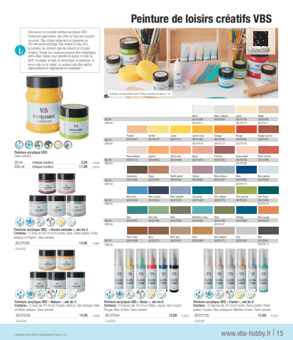 Peinture acrylique VBS %u00ab Basic %u00bb, set de 6Contenu : 6 fl acons de 20 ml en Blanc, Jaune, Vert moyen, Rouge, Bleu et Noir. Sans solvant.30275 5412,891l=107,42 EUH208Peinture acrylique VBS %u00ab Pastel %u00bb, set de 6Contenu : 6 fl acons de 20 ml en Ivoire, Rose pastel, Violet pastel, Poudre, Bleu antique et Menthe %u00e0 l'eau. Sans solvant.30275 5512,891l=107,42 EUH208Peinture acrylique VBSSans solvant.50 mlchaque couleur3,291l=65,80230 mlchaque couleur11,991l=52,13Peinture acrylique VBS %u00ab Aurore bor%u00e9ale %u00bb, set de 5Contenu : 5 pots de 50 ml en Fuchsia, Baie, Violet pastel, Rose antique et Argent. Sans solvant.30275 6514,951l=59,80 EUH208Peinture acrylique VBS %u00ab Nature %u00bb, set de 5Contenu : 5 pots de 50 ml en Poudre, Abricot, Vert antique, Kaki et Blanc antique. Sans solvant.30275 6314,951l=59,80 EUH208+HO+HOwww.vbs-hobby.frL%u00e9gende des ic%u00f4nes & pictogrammes p. 33| 15Peinture de loisirs cr%u00e9atifs VBS Exemple de d%u00e9coration avec Petites lamelles en bois p. 18.D%u00e9couvrez la nouvelle peinture acrylique VBS ! Fortement pigment%u00e9e, elle offre un tr%u00e8s bon pouvoir couvrant. Elle s'%u00e9tale facilement et pr%u00e9sente un fi ni mat apr%u00e8s s%u00e9chage. Elle r%u00e9siste %u00e0 l'eau et %u00e0 la lumi%u00e8re, ne contient pas de solvant et n'a pas d'odeur. Toutes les couleurs peuvent %u00eatre m%u00e9lang%u00e9es entre elles. Id%u00e9ale pour peindre la pierre, le bois, le MDF, le papier, la toile, la c%u00e9ramique, le plastique, la terre cuite ou le m%u00e9tal. La surface doit %u00eatre s%u00e8che, d%u00e9poussi%u00e9r%u00e9e et d%u00e9graiss%u00e9e au pr%u00e9alable !BlancBlanc antiqueIvoireBeige50 ml30274 8830274 9230274 7630274 69230 ml30275 1730275 1230275 11PoudreVanilleJauneJaune curryOrangeRougeRouge carmin50 ml30275 0730274 7930274 7730274 9530274 8230275 0130274 91230 ml---30275 1830275 1530275 19-Rose antiqueApricotVieux roseBaiesFuchsiaRose pastelRose fuchsia50 ml30274 7430274 6530274 6630274 7030274 8530275 0330274 96230 ml30275 20AubergineFigueViolet pastelViolineBleu antiqueBleuBleu glacier50 ml30274 6830274 7830274 8430274 9330274 6730274 8030274 94230 ml30275 13Bleu clairBleu marineBleu lavandeTurquoiseVert antiqueVert pommeVert fonc%u00e950 ml30274 9830275 0530275 1030275 0830274 7330274 7530274 86230 ml30275 16VertVert clairKakiMenthe %u00e0 l'eauOliveP%u00e9troleBrun rouge50 ml30274 9730274 9930275 0030275 0430275 0930275 0630275 02230 ml----30275 21--Terre cuiteBrunBrun grisOcreGris antiqueGrisNoir50 ml30274 8930274 7230274 8730274 9030274 7130274 8330274 81230 ml30275 14Fiche3558