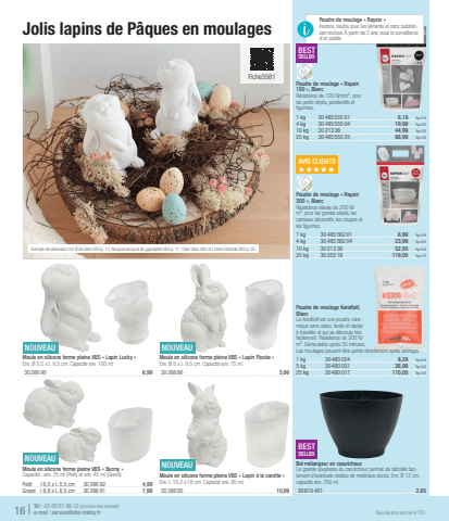 BESTSELLERPoudre de moulage %u00ab Raysin 100 %u00bb, BlancR%u00e9sistance de 120 N/mm%u00b2,pour les petits objets, pendentifs et fi gurines.1 kg30485 555 016,191kg=6,194 kg30485 555 0419,991kg=5,0010 kg30213 3644,991kg=4,5025 kg30485 555 2588,991kg=3,56AVIS%u00a0CLIENTSxxxxxPoudre de moulage %u00ab Raysin 200 %u00bb, BlancR%u00e9sistance %u00e9lev%u00e9e de 200 N/m%u00b2, pour les grands objets, les carreaux d%u00e9coratifs, les coupes et les fi gurines.1 kg30485 562 016,991kg=6,994 kg30485 562 0423,991kg=6,0010 kg30213 3852,951kg=5,2925 kg30252 19119,001kg=4,76NOUVEAUMoule en silicone forme pleine VBS %u00ab Lapin Lucky %u00bbEnv. %u00d8 5,5 x L 9,5 cm. Capacit%u00e9 env. 100 ml.30286 906,99NOUVEAUMoule en silicone forme pleine VBS %u00ab Lapin Flocke %u00bbEnv. %u00d8 5 x L 9,5 cm. Capacit%u00e9 env. 75 ml.30286 865,99Poudre de moulage Kerafl ott, BlancLa Kerafl ott est une poudre c%u00e9ramique sans odeur, facile et rapide %u00e0 travailler et qui se d%u00e9moule tr%u00e8s facilement. R%u00e9sistance de 200 N/m%u00b2. D%u00e9moulable apr%u00e8s 30 minutes. Les moulages peuvent %u00eatre peints directement apr%u00e8s s%u00e9chage.1 kg30480 0248,291kg=8,295 kg30480 03126,991kg=5,4025 kg30480 017110,001kg=4,40NOUVEAUMoule en silicone forme pleine VBS %u00ab Bunny %u00bbCapacit%u00e9 : env. 35 ml (Petit) et env. 45 ml (Grand).Petitl 6,5 x L 5,5 cm30286 924,99Grandl 8,8 x L 6,5 cm30286 917,99NOUVEAUMoule en silicone forme pleine VBS %u00ab Lapin %u00e0 la carotte %u00bbEnv. L 10,2 x l 8 cm. Capacit%u00e9 env. 95 ml.30286 9510,99BESTSELLERBol m%u00e9langeur en caoutchoucLa grande souplesse du caoutchouc permet de d%u00e9coller facilement d'%u00e9ventuels r%u00e9sidus de mat%u00e9riaux durcis. Env. %u00d8 13 cm, capacit%u00e9 env. 700 ml.30810 4012,6516 |T%u00e9l : 03 69 61 69 10 (num%u00e9ro non surtax%u00e9)e-mail : service@vbs-hobby.frTous les prix sont en %u20ac TTC.Exemple de d%u00e9coration mit %u0152ufs d%u00e9co VBS p. 13, Bouquet bouquet de gypsophile VBS p. 17, Osier d%u00e9co VBS et Lichen d'Islande VBS p. 25.Poudre de moulage %u00ab Raysin %u00bbInodore, neutre pour les aliments et sans substances nocives. %u00c0 partir de 3 ans, sous la surveillance d'un adulte. Jolis lapins de P%u00e2ques en moulages Fiche3581