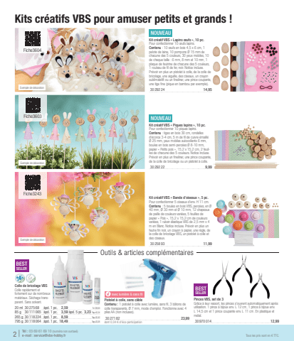 NOUVEAUKit cr%u00e9atif VBS %u00ab Lapins %u0153ufs %u00bb, 10 pc.Pour confectionner 10 %u0153ufs lapins.Contenu : 10 %u0153ufs en bois 4,5 x 6 cm, 1 pelote de laine, 10 pompons %u00d8 15 mm de chacune des 5 couleurs, 30 yeux mobiles, 10 de chaque taille : 6 mm, 8 mm et 10 mm, 1 plaque de feutrine de chacune des 5 couleurs, 1 rouleau de fi l de fer, noir. Notice incluse. Pr%u00e9voir en plus un pistolet %u00e0 colle, de la colle de bricolage, une aiguille, des ciseaux, un crayon sublimatstift ou un fi neliner, une pince coupante, une tige fi ne (pique en bambou par exemple).30292 2414,95NOUVEAUKit cr%u00e9atif VBS %u00ab Piques lapins %u00bb, 10 pc.Pour confectionner 10 piques lapins.Contenu : tiges en bois 30 cm, rondelles d'%u00e9corce 3-4 cm, 5 m de fi l de cuivre %u00e9maill%u00e9 %u00d8 25 mm, yeux mobiles autocollants 6 mm, boules en bois semi-perc%u00e9es %u00d8 8-10 mm, papier %u00ab Petits pois %u00bb, 15,2 x 15,2 cm, 2 feuilles de chacune des 5 couleurs. Notice incluse. Pr%u00e9voir en plus un fi neliner, une pince coupante, de la colle de bricolage ou un pistolet %u00e0 colle.30292 229,99Kit cr%u00e9atif VBS %u00ab Bande d'oiseaux %u00bb, 5 pc.Pour confectionner 5 oiseaux d'env. H 11 cm.Contenu : 5 boules en bois VBS, perc%u00e9es, en %u00d8 40 mm, %u00d8 30 mm et %u00d8 10 mm, 12 chapeaux de paille de couleurs vari%u00e9es, 5 feuilles de papier %u00ab Pois %u00bb, 15,2 x 15,2 cm de couleurs vari%u00e9es, 1 ruban %u00e9lastique VBS de 2,5 mm x 4 m en Blanc. Notice incluse. Pr%u00e9voir en plus un feutre fi n noir, un crayon %u00e0 papier, une r%u00e8gle, de la colle de bricolage VBS, un pistolet %u00e0 colle et des ciseaux.30258 9311,99yavec lumi%u00e8re & sans fi lPistolet %u00e0 colle, sans c%u00e2bleContenu : 1 pistolet %u00e0 colle avec lumi%u00e8re, sans fi l, 3 b%u00e2tons de colle transparents, %u00d8 7 mm, mode d'emploi. Fonctionne avec 4 piles AA (non incluses).30271 8223,99dont 0,04 %u20ac d'%u00e9co-participationBESTSELLERColle de bricolage VBSColle rapidement et fortement sur de nombreux mat%u00e9riaux. S%u00e9chage transparent. Sans solvant.20 ml30275 68%u00e0pd. 1 pc.2,591l=129,5085 g30111 065%u00e0pd. 1 pc.3,59%u00e0pd. 5 pc.3,231kg=42,24265 g30118 224%u00e0pd. 1 pc.8,591kg=32,42795 g30118 064%u00e0pd. 1 pc.18,491kg=23,26BESTSELLERPinces VBS, set de 3Gr%u00e2ce %u00e0 leur ressort, les pinces s'ouvrent automatiquement apr%u00e8s utilisation. 1 pince %u00e0 bijoux env. L 12 cm, 1 pince %u00e0 bijoux env. L 14,5 cm et 1 pince coupante env. L 11 cm. En plastique et m%u00e9tal.30970 01412,992 |T%u00e9l : 03 69 61 69 10 (num%u00e9ro non surtax%u00e9)e-mail : service@vbs-hobby.frTous les prix sont en %u20ac TTC.Exemple de d%u00e9corationExemple de d%u00e9corationExemple de d%u00e9corationFiche3604Fiche3243 Kits cr%u00e9atifs VBS pour amuser petits et grands ! Outils & articles compl%u00e9mentaires Fiche3603