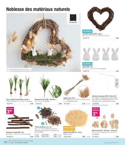 Lagurus, env. 25 g35-40 tiges d'env. L 50-60 cm. Fleurs d'env. %u00d8 4-7 cm. Mat%u00e9riau naturel.30134 575,491kg=219,60Fleurs %u00e0 bulbe de printemps, set de 44 fl eurs diff%u00e9rentes. Env. L 20 cm. En plastique.30229 754,49Bouquet de fl eurs VBS %u00ab Bloswen %u00bbEnv. L 33 cm. En plastique.30226 052,99Mini-formes VBS %u00ab Petit %u0153uf %u00bb, set de 48Env. 2,5-3,5 cm, %u00e9paisseur env. 2,5 mm. En contreplaqu%u00e9.30195 913,99set de 48seulement399NOUVEAUCouronne naturelle VBS %u00ab C%u0153ur %u00bbEnv. L 25 x l 25 x H 4 cm. En %u00e9corce et fi l de fer.30287 055,99NOUVEAULapins VBS, 4 pc.Env. L 2,3 x l 2,3 x H 4 cm. En polyr%u00e9sine.30287 204,49Branches en fagot VBS, 6 pc.Env. %u00d8 env. 1-2 cm, env. L 20 cm. En sapin.30268 183,99seulement399Plumes de poules, env. 3 gEnv. L 5,5-13 cm. Mat%u00e9riau naturel, des diff%u00e9rences dans la forme et la couleur sont donc possibles.A. Gris30618 6942,791kg=930,00B. Brun30618 7002,791kg=930,00AVIS%u00a0CLIENTSxxxxxLaine de bois VBS, env. 100 gMat%u00e9riau naturel.30619 0593,991kg=39,90Guirlande lumineuse VBS 10 micro-LEDPour l'int%u00e9rieur. Lumi%u00e8re blanche chaude. Minuterie. C%u00e2ble en fi l m%u00e9tallique dor%u00e9 d'env. 67 cm. Fonctionne avec 2 piles CR2032 incluses.30268 883,99dont 0,04 %u20ac d'%u00e9co-participation24 |T%u00e9l : 03 69 61 69 10 (num%u00e9ro non surtax%u00e9)e-mail : service@vbs-hobby.frTous les prix sont en %u20ac TTC.Exemple de d%u00e9coration avec %u0152ufs de caille p. 12.AB Noblesse des mat%u00e9riaux naturels Fiche3595