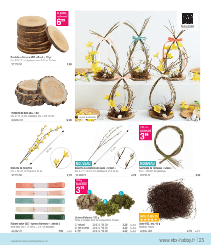 AVIS%u00a0CLIENTSxxxxxOsier VBS, env. 40 gMat%u00e9riau naturel.30609 0503,491kg=87,25Lichen d'Islande, 100 gFacile %u00e0 travailler dans les compositions fl orales.C. Naturel30615 716 003,991kg=39,90D. Vert de mai30615 716 153,991kg=39,90E. Vert30615 716 503,991kg=39,90Rubans satin VBS %u00ab Apricot Harmony %u00bb, set de 5Bord tiss%u00e9. Env. l 10 mm x L 3 m. En polyester.30282 194,991m=0,33NOUVEAUGuirlande de rameaux %u00ab Grace %u00bbEnv. L 150 cm. En plastique.30237 023,69NOUVEAUBranche de chatons de saule %u00ab Cream %u00bbEnv. L 77 x l 8 cm. En plastique et en fi l de fer.30286 224,79Branche de forsythiaEnv. L 80 cm. En tissu et fi l de fer.30253 682,79Rondelles d'%u00e9corce VBS %u00ab Rond %u00bb, 10 pc.Env. %u00d8 9-11 cm, %u00e9paisseur env. 6-8 cm. En bois.30206 606,99Tron%u00e7ons de bois VBS, 4 pc.Env. %u00d8 10-16 cm, %u00e9paisseur env. 2 cm. En pin.30616 73712,99100 gseulement399150 cmseulement36910 pi%u00e8cesseulement699www.vbs-hobby.fr| 25L%u00e9gende des ic%u00f4nes & pictogrammes p. 33Exemple de d%u00e9coration 80 cm CDEFiche3586