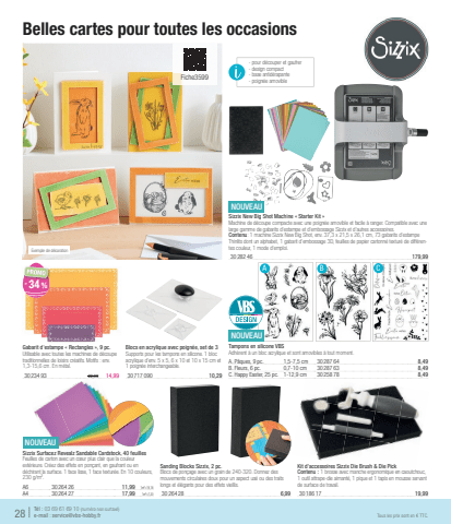 NOUVEAUSizzix New Big Shot Machine %u00ab Starter Kit %u00bbMachine de d%u00e9coupe compacte avec une poign%u00e9e amovible et facile %u00e0 ranger. Compatible avec une large gamme de gabarits d'estampe et d'embossage Sizzix et d'autres accessoires.Contenu: 1 machine Sizzix New Big Shot, env. 37,3 x 21,5 x 26,1 cm, 73 gabarits d'estampe Thinlits dont un alphabet, 1 gabarit d'embossage 3D, feuilles de papier cartonn%u00e9 textur%u00e9 de diff%u00e9rentes couleur, 1 mode d'emploi.30282 46179,99NOUVEAUSizzix Surfacez Revealz Sandable Cardstock, 40 feuillesFeuilles de carton avec un c%u0153ur plus clair que la couleur ext%u00e9rieure. Cr%u00e9ez des effets en pon%u00e7ant, en gaufrant ou en d%u00e9chirant la surface. 1 face lisse, 1 face textur%u00e9e. En 10 couleurs, 230 g/m%u00b2.A630264 2611,991m%u00b2=19,18A430264 2717,991m%u00b2=7,20Sanding Blocks Sizzix, 2 pc.Blocs de pon%u00e7age avec un grain de 240-320. Donnez des mouvements circulaires doux pour un aspect us%u00e9 ou des traits longs et %u00e9l%u00e9gants pour des effets vieillis.30264 286,99Kit d'accessoires Sizzix Die Brush & Die PickContenu : 1 brosse avec manche ergonomique en caoutchouc, 1 outil attrape-die aimant%u00e9, 1 pique et 1 tapis en mousse servant de surface de travail.30186 1719,9928 |T%u00e9l : 03 69 61 69 10 (num%u00e9ro non surtax%u00e9)e-mail : service@vbs-hobby.frTous les prix sont en %u20ac TTC.Exemple de d%u00e9corationGabarit d'estampe %u00ab Rectangles %u00bb, 9 pc.Utilisable avec toutes les machines de d%u00e9coupe traditionnelles de loisirs cr%u00e9atifs. Motifs : env. 1,3-15,6 cm. En m%u00e9tal.30234 9322,9914,99Blocs en acrylique avec poign%u00e9e, set de 3Supports pour les tampons en silicone. 1 bloc acrylique d'env. 5 x 5, 6 x 10 et 10 x 15 cm et 1 poign%u00e9e interchangeable.30717 09010,29 Belles cartes pour toutes les occasions - pour d%u00e9couper et gaufrer- design compact- base antid%u00e9rapante- poign%u00e9e amovibleABCFiche3599NOUVEAUTampons en silicone VBSAdh%u00e8rent %u00e0 un bloc acrylique et sont amovibles %u00e0 tout moment.A. P%u00e2ques, 9 pc.1,5-7,5 cm30287 648,49B. Fleurs, 6 pc.0,7-10 cm30287 638,49C. Happy Easter, 25 pc.1-12,9 cm30258 788,49- 34 %