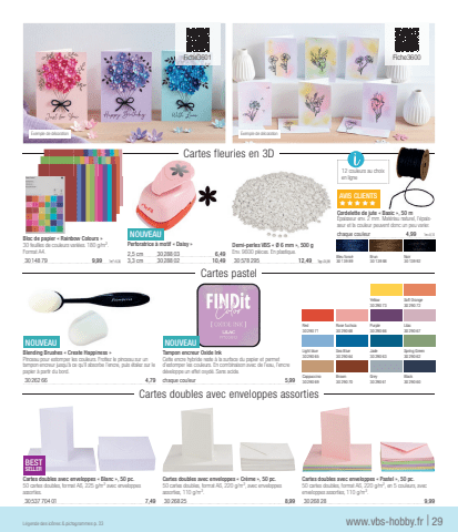 Cartes doubles avec enveloppes %u00ab Pastel %u00bb, 50 pc.50 cartes doubles, format A6, 220 g/m%u00b2, en 5 couleurs, avec enveloppes assorties, 110 g/m%u00b2.30268 289,99Cartes doubles avec enveloppes %u00ab Cr%u00e8me %u00bb, 50 pc.50 cartes doubles, format A6, 220 g/m%u00b2, avec enveloppes assorties, 110 g/m%u00b2.30268 258,99BESTSELLERCartes doubles avec enveloppes %u00ab Blanc %u00bb, 50 pc.50 cartes doubles, format A6, 225 g/m%u00b2 avec enveloppes assorties.30537 704 017,49NOUVEAUBlending Brushes %u00ab Create Happiness %u00bbPinceau pour estomper les couleurs. Frottez le pinceau sur un tampon encreur jusqu'%u00e0 ce qu'il absorbe l'encre, puis %u00e9talez sur le papier %u00e0 partir du bord.30262 664,79NOUVEAUTampon encreur Oxide InkCette encre hybride reste %u00e0 la surface du papier et permet d'estomper les couleurs. En combinaison avec de l'eau, l'encre d%u00e9veloppe un effet oxyd%u00e9. Sans acide.chaque couleur5,99www.vbs-hobby.fr| 29L%u00e9gende des ic%u00f4nes & pictogrammes p. 33Exemple de d%u00e9corationExemple de d%u00e9corationBloc de papier %u00ab Rainbow Colours %u00bb30 feuilles de couleurs vari%u00e9es. 180 g/m%u00b2. Format A4.30148 799,991m%u00b2=5,34NOUVEAUPerforatrice %u00e0 motif %u00ab Daisy %u00bb2,5 cm30288 036,493,3 cm30288 0210,49Demi-perles VBS %u00ab %u00d8 6 mm %u00bb, 500 gEnv. 9600 pi%u00e8ces. En plastique.30578 29512,491kg=24,98Bleu fonc%u00e9BrunNoir30139 8930139 8830139 92YellowSoft Orange30290 7330290 72RedRose fuchsiaPurpleLilac30290 7130290 6830290 6630290 67Light blueSea BlueJadeSpring Green30290 6530290 6430290 6330290 62CappuccinoBrownGreyBlack30290 6930290 7030290 6130290 60 Cartes fleuries en 3D Cartes pastel Cartes doubles avec enveloppes assorties 12 couleurs au choix en ligneAVIS%u00a0CLIENTSxxxxxCordelette de jute %u00ab Basic %u00bb, 50 m%u00c9paisseur env. 2 mm. Mat%u00e9riau naturel, l'%u00e9paisseur et la couleur peuvent donc un peu varier.chaque couleur4,991m=0,10Fiche3601Fiche3600