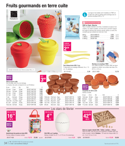 Exemple de d%u00e9coration avec Peinture acrylique VBS p. 15.BESTSELLERCoupelles en terre cuiteInt%u00e9rieur %u00e9maill%u00e9.%u00d8 ext.%u00d8 int.NbR%u00e9f.%u20ac13,5 cm10 cm2 pc.30571 654 125,296,9 cm5 cm5 pc.30571 654 065,499 cm7 cm5 pc.30571 654 086,3915,7 cm12 cm2 pc.30571 654 146,3911,3 cm8,5 cm5 pc.30571 654 106,99BESTSELLERAssortiment de perles en bois VBSFormes, tailles et couleurs vari%u00e9es.30577 458f%u00e9vrier 16,7923,991kg=23,99%u0152uf VBS, en 2 partiesInt%u00e9rieur %u00e9maill%u00e9. Env. %u00d8 11 x H 15 cm. En c%u00e9ramique.30570 961f%u00e9vrier 4,296,19%u0152ufs en papier m%u00e2ch%u00e9 VBS %u00ab Tailles vari%u00e9es %u00bb, 140 pc.Faits %u00e0 la main, avec lien pour les suspendre, emball%u00e9s dans une bo%u00eete en papier m%u00e2ch%u00e9, Contenu : 35 %u0153ufs de chaque taille 3,5 cm, 4 cm, 5,5 cm, 6 cm.30789 851f%u00e9vrier 42,9959,99BESTSELLERPots en terre cuiteNon %u00e9maill%u00e9s, avec trou de drainage.La hauteur des pots correspond env. au %u00d8 int%u00e9rieur.%u00d8 ext.%u00d8 int.NbR%u00e9f.%u20ac2,5 cm2 cm10 pc.30571 647 023,693,6 cm3,2 cm10 pc.30571 647 033,994,7 cm4 cm10 pc.30571 647 044,095,7 cm5 cm10 pc.30571 647 054,197 cm6,3 cm10 pc.30571 647 064,298,1 cm7,3 cm10 pc.30571 647 074,5912,5 cm11,3 cm5 pc.30571 647 114,699,1 cm8,3 cm10 pc.30571 647 084,9910,2 cm9,4 cm10 pc.30571 647 095,1914,3 cm13,2 cm5 pc.30571 647 135,1911,5 cm10,7 cm10 pc.30571 647 105,6917,7 cm16,2 cm2 pc.30571 647 165,7915,7 cm14,3 cm5 pc.30571 647 145,8920 cm18,5 cm2 pc.30571 647 186,59Star du mois1679-30 %Star du mois429-30 %Star du mois4299-28 %%u00e0pd.36934 |T%u00e9l : 03 69 61 69 10 (num%u00e9ro non surtax%u00e9)e-mail : service@vbs-hobby.frTous les prix sont en %u20ac TTC.Set d%u2019%u00e9bauchoirs VBS, 3 pc.3 b%u00e2tonnets de modelage diff%u00e9rents. Env. L 15 cm. En plastique.30110 4572,293 pi%u00e8cesseulement229Rouleau en acrylique FIMOPour %u00e9taler les p%u00e2tes %u00e0 modeler FIMO de fa%u00e7on r%u00e9guli%u00e8re et obtenir une surface bien lisse. Env. %u00d8 2,5 x l 20 cm.30511 48312,79yPlus de couleurs en ligneFIMO air Basic, BlancheP%u00e2te %u00e0 modeler s%u00e9chant %u00e0 l'air libre. Consistance souple et non collante. Les objets model%u00e9s, une fois durcis, prennent l'aspect de l'argile et peuvent %u00eatre ponc%u00e9s, perc%u00e9s, peints ou vernis. Ne convient pas aux enfants de moins de 3 ans500 g30510 882 013,301kg=6,601 000 g30510 899 016,401kg=6,402 000 g30267 0812,501kg=6,25 Fruits gourmands en terre cuite Les tiges et les feuilles sont model%u00e9es en FIMO air %u00e0 l'aide des outils et peintes apr%u00e8s s%u00e9chage avec la peinture acrylique VBS p. 15. Les stars de f%u00e9vrier Fiche3572