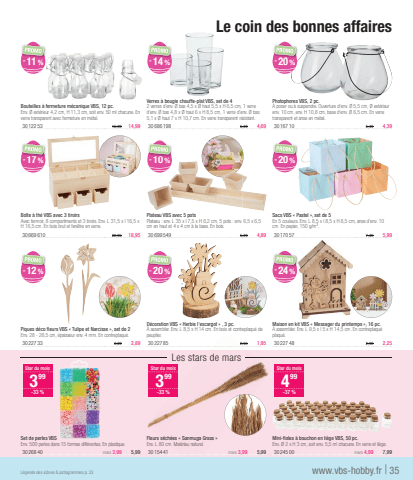 - 17 %- 10 %- 20 %- 12 %- 20 %- 24 %Mini-fi oles %u00e0 bouchon en li%u00e8ge VBS, 50 pc.Env. %u00d8 2 x H 3 cm, soit env. 5,5 ml chacune. En verre et li%u00e8ge.30245 00mars 4,997,99Fleurs s%u00e9ch%u00e9es %u00ab Sanmuga Grass %u00bbEnv. L 80 cm. Mat%u00e9riau naturel.30154 41mars 3,995,99Set de perles VBSEnv. 500 perles dans 15 formes diff%u00e9rentes. En plastique.30268 40mars 3,995,99Maison en kit VBS %u00ab Messager du printemps %u00bb, 16 pc.%u00c0 assembler. Env. L 9,5 x l 5 x H 14,5 cm. En contreplaqu%u00e9 plaqu%u00e9.30227 482,992,25D%u00e9coration VBS %u00ab Herbie l'escargot %u00bb , 3 pc.%u00c0 assembler. Env. L 8,5 x H 14 cm. En bois et contreplaqu%u00e9 de peuplier.30227 852,451,95Piques d%u00e9co fl eurs VBS %u00ab Tulipe et Narcisse %u00bb, set de 2Env. 28 - 28,5 cm, %u00e9paisseur env. 4 mm. En contreplaqu%u00e9.30227 333,292,89Bo%u00eete %u00e0 th%u00e9 VBS avec 3 tiroirsAvec fermoir, 8 compartiments et 3 tiroirs. Env. L 31,5 x l 16,5 x H 16,5 cm. En bois brut et fen%u00eatre en verre.30669 61022,9518,95Bouteilles %u00e0 fermeture m%u00e9canique VBS, 12 pc.Env. %u00d8 ext%u00e9rieur 4,2 cm, H 11,3 cm, soit env. 50 ml chacune. En verre transparent avec fermeture en m%u00e9tal.30122 5316,9914,99Star du mois499-37 %Star du mois399-33 %Star du mois399-33 %www.vbs-hobby.fr| 35L%u00e9gende des ic%u00f4nes & pictogrammes p. 33Verres %u00e0 bougie chauffe-plat VBS, set de 42 verres d%u2019env. %u00d8 bas 4,5 x %u00d8 haut 5,5 x H 6,5 cm, 1 verre d%u2019env. %u00d8 bas 4,8 x %u00d8 haut 6 x H 8,5 cm, 1 verre d%u2019env. %u00d8 bas 5,1 x %u00d8 haut 7 x H 10,7 cm. En verre transparent r%u00e9sistant.30686 1985,494,69Photophores VBS, 2 pc.%u00c0 poser ou %u00e0 suspendre. Ouverture d'env. %u00d8 5,5 cm, %u00d8 ext%u00e9rieur env. 10 cm, env. H 10,8 cm, base d'env. %u00d8 6,5 cm. En verre transparent et anse en m%u00e9tal.30167 105,494,39Plateau VBS avec 5 potsPlateau : env. L 35 x l 7,5 x H 6,2 cm, 5 pots : env. 6,5 x 6,5 cm en haut et 4 x 4 cm %u00e0 la base. En bois.30699 5495,494,89Sacs VBS %u00ab Pastel %u00bb, set de 5En 5 couleurs. Env. L 8,5 x l 8,5 x H 8,5 cm, anse d'env. 10 cm. En papier, 150 g/m%u00b2.30170 577,495,99Les stars de mars Le coin des bonnes affaires -- 11 %- 14 % 20 %