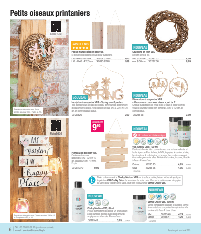 6 |T%u00e9l : 03 69 61 69 10 (num%u00e9ro non surtax%u00e9)e-mail : service@vbs-hobby.frTous les prix sont en %u20ac TTC.Exemple de d%u00e9coration avec Set de peinture acrylique VBS %u00ab Pastel %u00bb p. 15.NOUVEAUChalky Medium VBS, 80 mlProduit permettant de donner un effet ancien %u00e0 des surfaces peintes avec des peintures acryliques ou %u00e0 la craie. %u00c0 base d'eau. 30285 433,951l=49,38NOUVEAUy19 couleurs au choix en ligneVBS Chalky Color, 100 mlPeinture %u00e0 la craie tr%u00e8s couvrante avec une surface velout%u00e9e et facile %u00e0 poncer. Pour le bois, le MDF, le papier, le carton, la toile, la c%u00e9ramique, le polystyr%u00e8ne ou le verre. Les couleurs peuvent %u00eatre m%u00e9lang%u00e9es entre elles. R%u00e9siste %u00e0 la lumi%u00e8re, inodore, diluable %u00e0 l'eau. %u00c0 base d'eau.Cr%u00e8me30285 254,951l=49,50Olive30285 364,951l=49,50 EUH208NOUVEAUInscription %u00e0 suspendre VBS %u00ab Spring %u00bb, en 6 partiesTrois petites fl eurs et l'aile de l'oiseau sont fournies s%u00e9par%u00e9ment et peuvent %u00eatre coll%u00e9es. Avec cordon en jute. Env. L 22 x H 12,5 cm. En contreplaqu%u00e9 plaqu%u00e9.30288 202,99NOUVEAUD%u00e9corations %u00e0 suspendre VBS %u00ab Couronne et c%u0153ur avec oiseau %u00bb, set de 2Chaque suspension est livr%u00e9e avec 6 fl eurs %u00e0 coller comme vous le souhaitez (colle non comprise). Env. %u00d8 12 cm. En contreplaqu%u00e9.30288 383,99Panneau de direction VBSCordon en jute pour suspendre. Env. l 32 x H 40 cm, %u00e9paisseur env. 7,9 mm. En pin.30281 3799,95seulement995NOUVEAUCouronne en rotin VBSEn rotin et fi l de fer.env. %u00d8 25 cm30287 076,99env. %u00d8 30 cm30287 068,99AVIS%u00a0CLIENTSxxxxxPlaque murale d%u00e9co en bois VBSEn pin avec cordelette en jute pour suspendre.l 20 x H 50 x P 2 cm30695 978 029,49l 30 x H 40 x P 2,5 cm30695 978 019,99NOUVEAUVernis Chalky VBS, 100 mlVernis transparent, r%u00e9sistant et durable. Donne %u00e0 vos cr%u00e9ations une protection qui r%u00e9siste %u00e0 la lumi%u00e8re et %u00e0 l'eau. %u00c0 base d'eau.Mat30285 404,291l=42,90Satin%u00e930285 414,291l=42,90 EUH208Exemple de d%u00e9coration avec Peinture acrylique VBS p. 15 et Photophores VBS p. 35. Petits oiseaux printaniers %u00c9talez uniform%u00e9ment le Chalky Medium VBS sur la surface peinte, laissez s%u00e9cher et appliquez la peinture VBS Chalky Color de la couleur de votre choix. Poncez la peinture avec du papier de verre pour obtenir l'effet vieilli. Pour fi nir, recouvrez de vernis Chalky VBS.Fiche3588Fiche3605