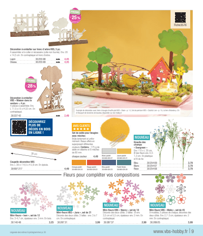 39 cm AVIS%u00a0CLIENTSxxxxxSet de sable pour bougies avec m%u00e8chesBr%u00fble lentement et uniform%u00e9ment. Beaux effets en superposant diff%u00e9rentes couleurs. Contenu : 175 g de sable en st%u00e9arine et 8 m%u00e8ches de 80 mm.chaque couleur4,49NOUVEAUKnautie des champs %u00ab Evergreen %u00bbEnv. l 10 x L 35 cm, %u00d8 des fl eurs env. 0,3-1,3 cm. En plastique et fi l de fer.Bleu30254 693,79Blanc30254 673,79Rose30254 683,79Coupelle d%u00e9corative VBSEnv. L 39 x l 14,5 x H 2,8 cm. En %u00e9pic%u00e9a.30697 2174,49D%u00e9coration %u00e0 embo%u00eeter VBS %u00ab Maison dans la verdure %u00bb, 4 pc.4 pi%u00e8ces %u00e0 assembler. Env. L 11,5 x l 5 x H 22 cm. En contreplaqu%u00e9.30227 423,492,49D%u00e9coration %u00e0 embo%u00eeter sur tronc d'arbre VBS, 5 pc.%u00c0 assembler et %u00e0 coller si n%u00e9cessaire (colle non fournie). Env. 20 x 14,5 cm. En contreplaqu%u00e9 et tronc d'arbre.Lapin30255 985,954,45Oiseau30255 995,954,45www.vbs-hobby.fr| 9L%u00e9gende des ic%u00f4nes & pictogrammes p. 33Exemple de d%u00e9coration avec Verre %u00e0 bougie chauffe-plat VBS %u00ab Bowl %u00bb p. 14, Set de peinture VBS %u00ab Colorful Live %u00bb p. 15, Lichen d'Islande p. 25 et Bouquet de branches de bouleau disponible sur vbs-hobby.fr.NOUVEAUMini-fl eurs VBS %u00ab Noora %u00bb, set de 18D%u00e9cor%u00e9s des deux c%u00f4t%u00e9s. 2 tailles : %u00d8 env. 3,5 cm et 5,5 cm, %u00e9paisseur env. 2 mm. En contreplaqu%u00e9.30287 372,99NOUVEAUMini-fl eurs VBS %u00ab Juna %u00bb, set de 21D%u00e9cor%u00e9s des deux c%u00f4t%u00e9s. 3 tailles : env. 3 %u00e0 7 cm. En contreplaqu%u00e9.30287 313,99NOUVEAUMini-fl eurs %u00ab Iven %u00bb, set de 12Env. 3-4,7 cm, %u00e9paisseur env. 3 mm. En bois.30140 483,25 Fleurs pour compl%u00e9ter vos compositions Blanc pastelJaune pastel30500 425 2730500 425 21Orange pastelRouge pastelBleu pastelPastel Green30500 425 2430500 425 2230500 425 2330500 425 20Fiche3576- 25 %- 28 %NOUVEAUMini-fl eurs VBS %u00ab Malia %u00bb, set de 459 mod%u00e8les, 5 pi%u00e8ces de chaque, d%u00e9cor%u00e9es des deux c%u00f4t%u00e9s. Env. 2,7-3 cm, %u00e9paisseur env. 2 mm. En contreplaqu%u00e9.30289 255,99 D%u00c9COUVREZPLUS DED%u00c9COS EN BOISEN LIGNE !