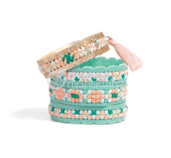 Le kit créatif bijoux point de croix « Pix’ Trésor – Joy » contient tout le nécessaire (fils, aiguille à broder, etc.) pour créer et broder au point de croix deux superbes bracelets : un bracelet manchette en plastique (env. l 4,5 cm) et un bracelet pailleté en plastique (env. l 1,5 cm. Tous deux mesurant environ 20 cm de long.