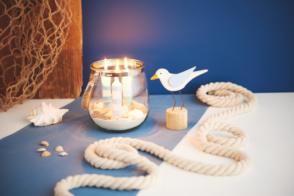 Pour finir, placez la mouette Freddy à côté du photophore. Ce petit personnage donne à votre idée de bricolage un caractère ludique et complète harmonieusement la décoration maritime.