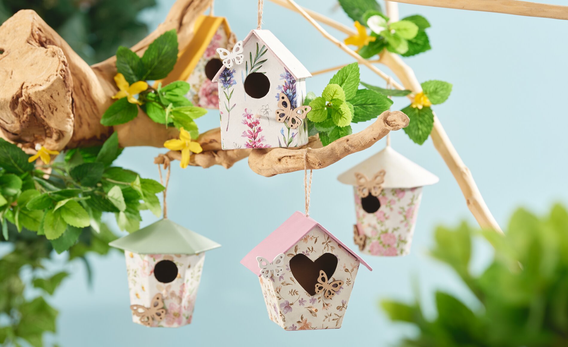 Vous pouvez maintenant compléter la décoration des nichoirs avec quelques accessoires : papillons ou fleurs en bois, rubans, strass, etc.