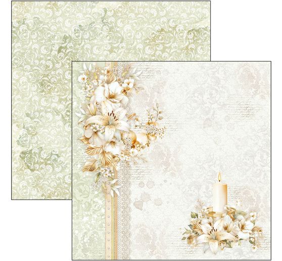 Plongez dans le monde enchanteur du papier de scrapbooking "Blessing Day" et laissez libre cours à votre créativité. Ces papiers à motifs recto verso dans de douces nuances de crème et de beige, décorés d' anges, de lys, de colombes, de rinceaux de fleurs et d' ornements délicats, sont la base idéale pour vos projets créatifs.