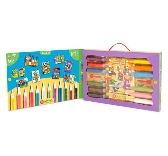 Très complet, ce maxi kit contient coloré Bleu, Bleu clair, Rose, Violet, Vert clair, Vert foncé, Rouge, Jaune, Orange, Blanc, Noir et Marron, 12 dessins préencollés, imprimés et prédécoupés (6 d’env. 15 x 10 cm et 6 d’env. 15 x 20 cm), 2 spatules et 1 grand bac en papier. Des explications et des exemples d’utilisation sont inclus et des tutoriels vidéos sont disponibles par QR-Code.