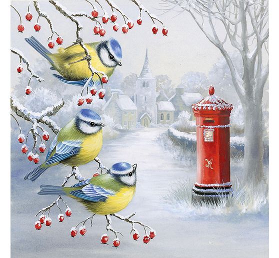 Proposée en paquet de 20, cette serviette en papier d’env. 33 x 33 cm représentant à quatre reprises trois oiseaux posés sur une branche d’arbre enneigé avec en arrière-plan une belle boîte aux lettres rouge à l’entrée d’un village, va apporter un charme singulier au dressage de votre table.