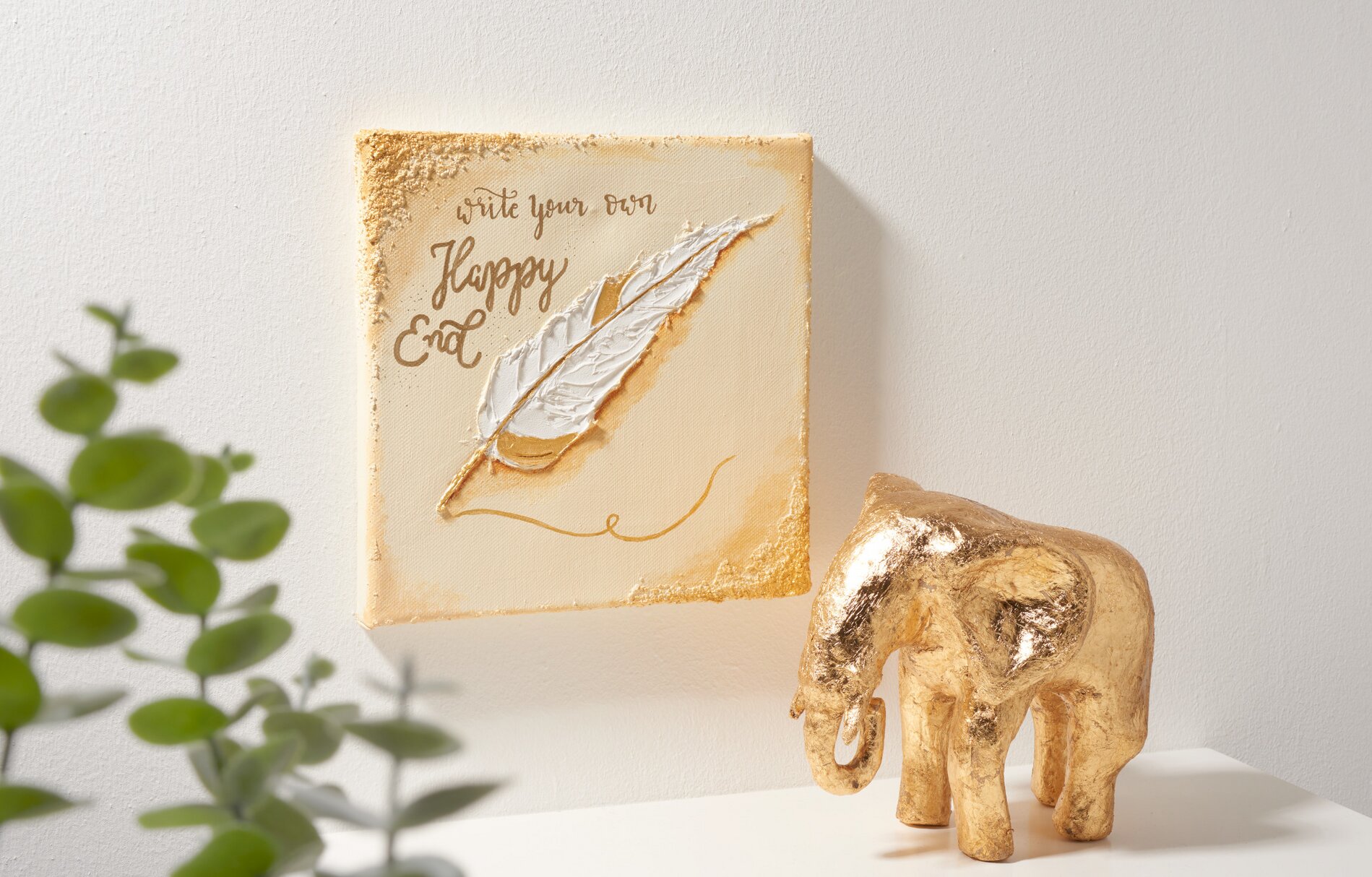 Dès que les pâtes de structure sont sèches, peignez l'ensemble du châssis, à l'exception du relief de la plume, avec de la peinture acrylique ivoire. Peignez les ombres de la plume avec la couleur ocre et peignez également les ombres des coins avec l'ocre plus foncé. Ajoutez des touches subtiles de peinture dorée sur la plume, dessinez une ligne courbe partant de la pointe de la plume.