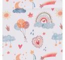 Bienvenue au « Pays des rêves » - un lieu plein d'imagination et de créativité ! Le tissu coton au mètre « Pays de rêve » vous transporte dans un monde enchanteur de ballons, de cœurs, d'arcs-en-ciel et de nuages, le tout dans des couleurs pastel douces sur un fond de couleur écru.